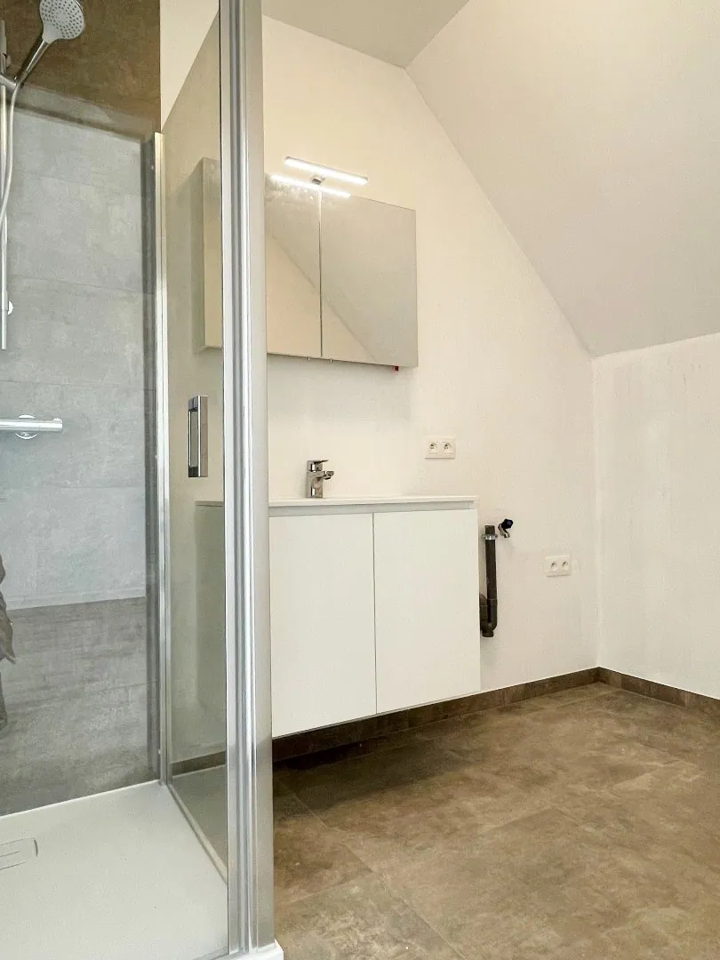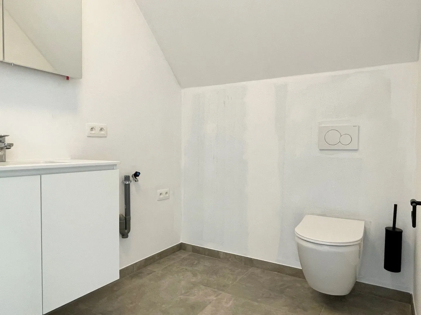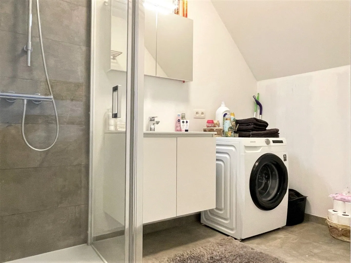 De slaapkamer is aan de achterzijde, die meteen dan toegang geeft naar dé grote troef: een groot balkon met heerlijk zicht op ’t groen! De badkamer sluit ook aan bij de slaapkamer, en is voorzien van douche, badkamermeubel, toilet en aansluiting van de wasmachine.