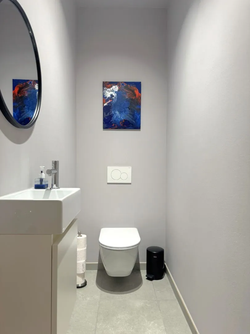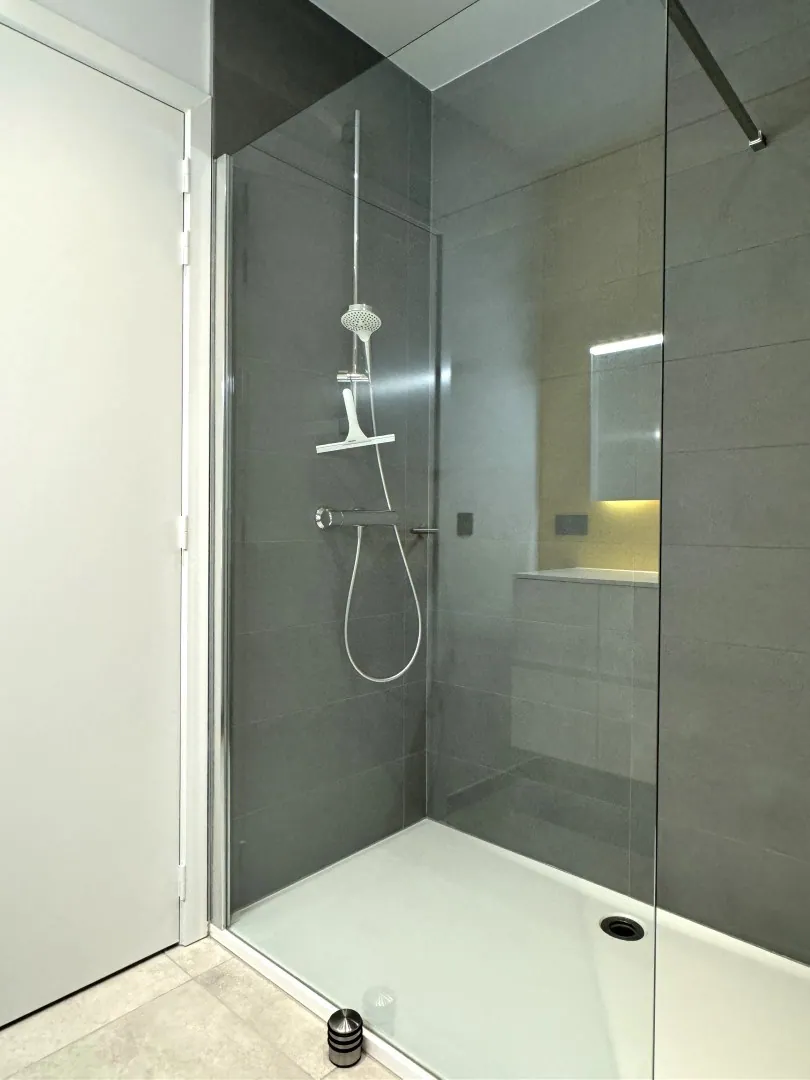De badkamer is voorzien van een ruime douche en een badkamermeubel. Het toilet is apart.