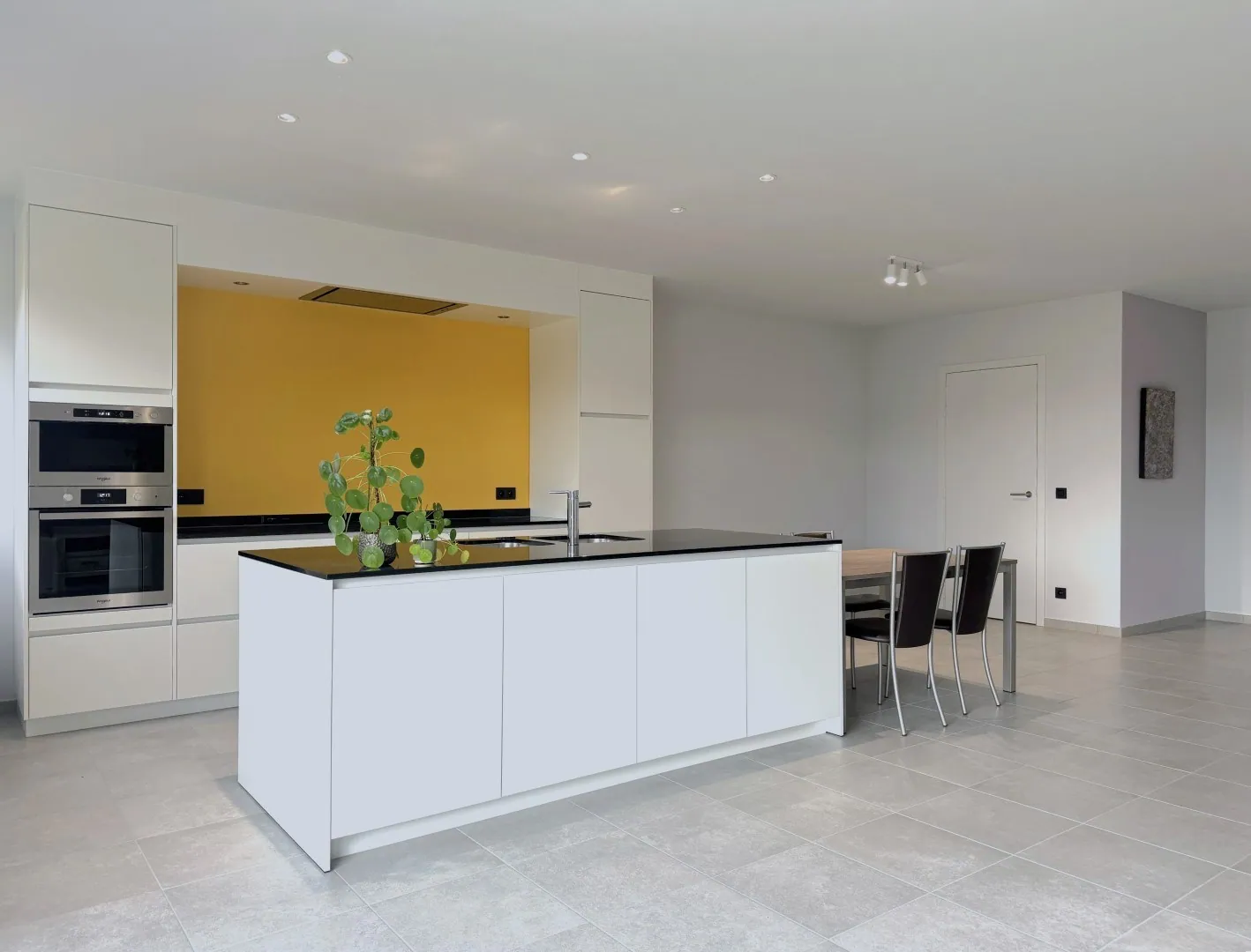 Effe beginnen aan de achterkant? Want daar vinden we dus die balzaal van een woonkamer met open keuken. Als je dat (stiekem veel te grote) bankstel hier niet kwijt kan, dan kan je ‘m nergens kwijt, toch? De keuken werd trouwens voorzien van alle nodige snufjes, inclusief de ontbijttafel. (Het eitje moet je zelf nog effe bakken).