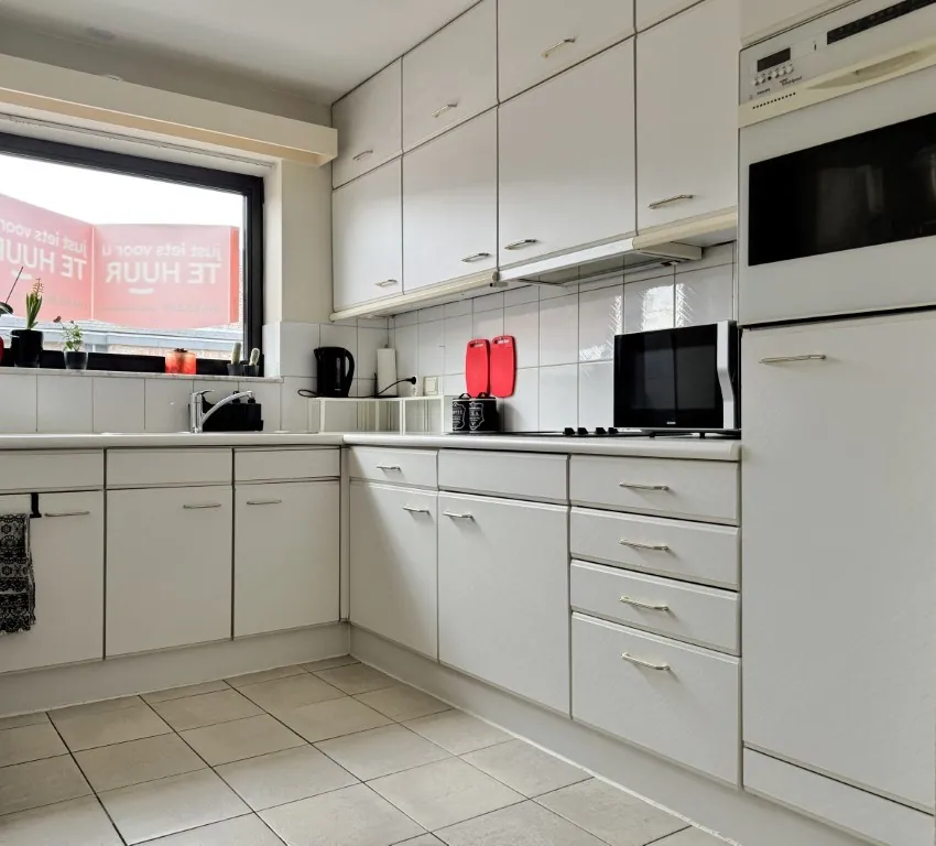 Aansluitend vinden we de keuken. Die is basic, maar netjes. En vooral ook: heerlijk ruim en met veel lichtinval. Alle snufjes die je nodig hebt, zitten er in. Naast de keuken is trouwens nog een compacte, maar handige bergplaats.