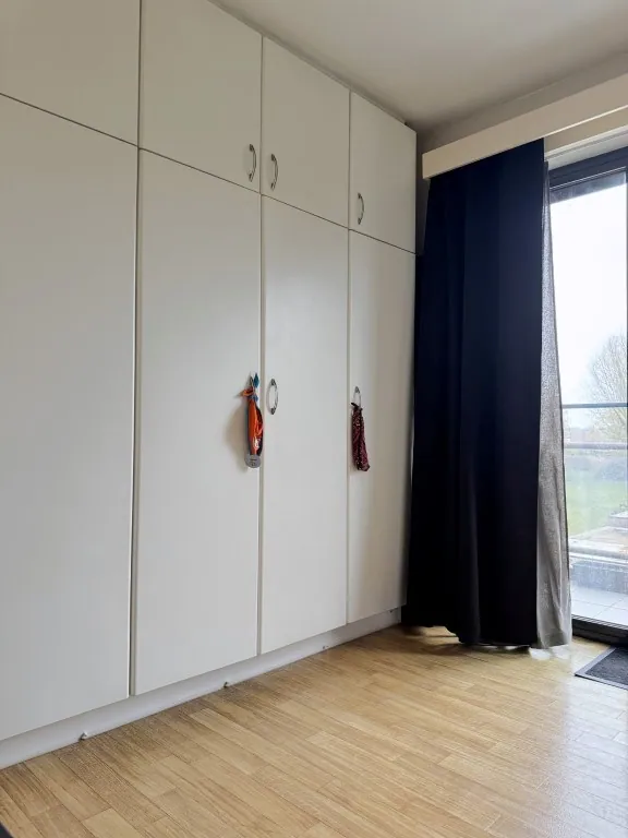 De slaapkamer zit aan de achterzijde, dus je hoeft (letterlijk) niet wakker te liggen van het verkeer. De 2de slaapkamer werd voorzien van ... een grote kastenwand, dus nét te krap voor een groot bed, maar ideaal als inloopkast of bureau. Hier vinden trouwens ook de aansluitingen voor wassen en drogen. Verder geeft deze kamer ook toegang naar het érg grote terras. Wist je trouwens dat je zo’n groen zicht had aan deze kant van de Grote Baan? Een fijn uitzicht en geen last van glurende buren: we like!