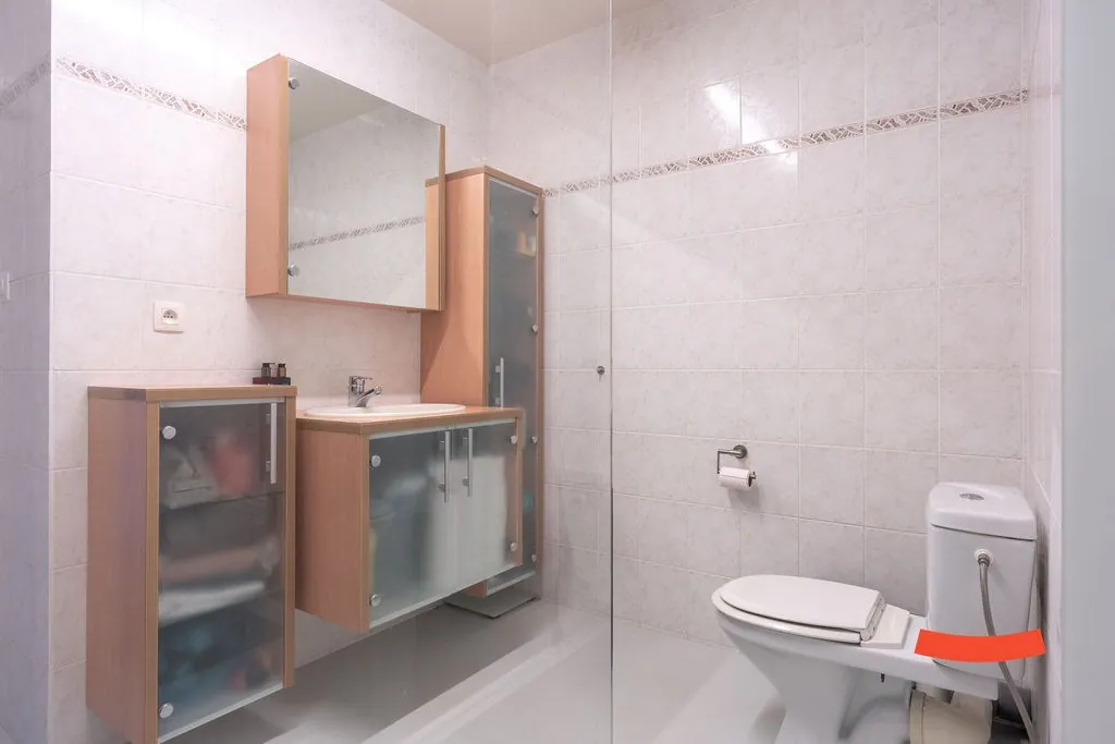 Achteraan zijn 2 ruime slaapkamers mét rolluiken. Verder is er een deels vernieuwde badkamer met inloopdouche, wastafel met kasten en een toilet. Er is nog een kleine bergruimte aanwezig. Hier vinden we de aansluitingen voor wassen en drogen.