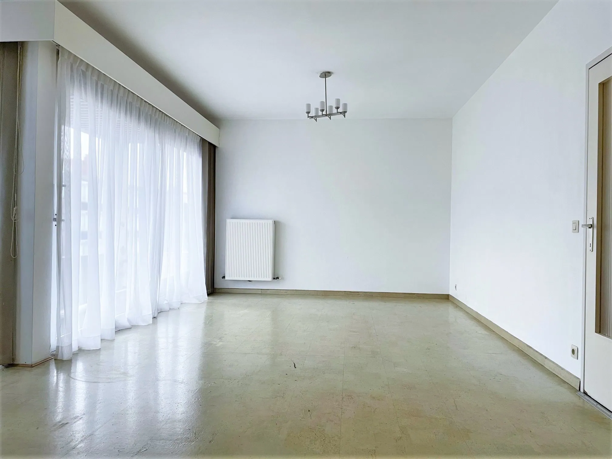 Aan de voorzijde zit de woonkamer: verrassend groot en heerlijk licht. Deze geeft toegang naar het eerste (overdekte) balkon. Aansluitend zit de keuken. Niet nieuw, maar lekker ruim en netjes. De eigenaar zorgt nog voor een koelkast met vriezer en een magnetron. De spoelbak, fornuis en afzuigkap werden al voorzien. Verder is er een aansluiting aanwezig voor de vaatwasser.