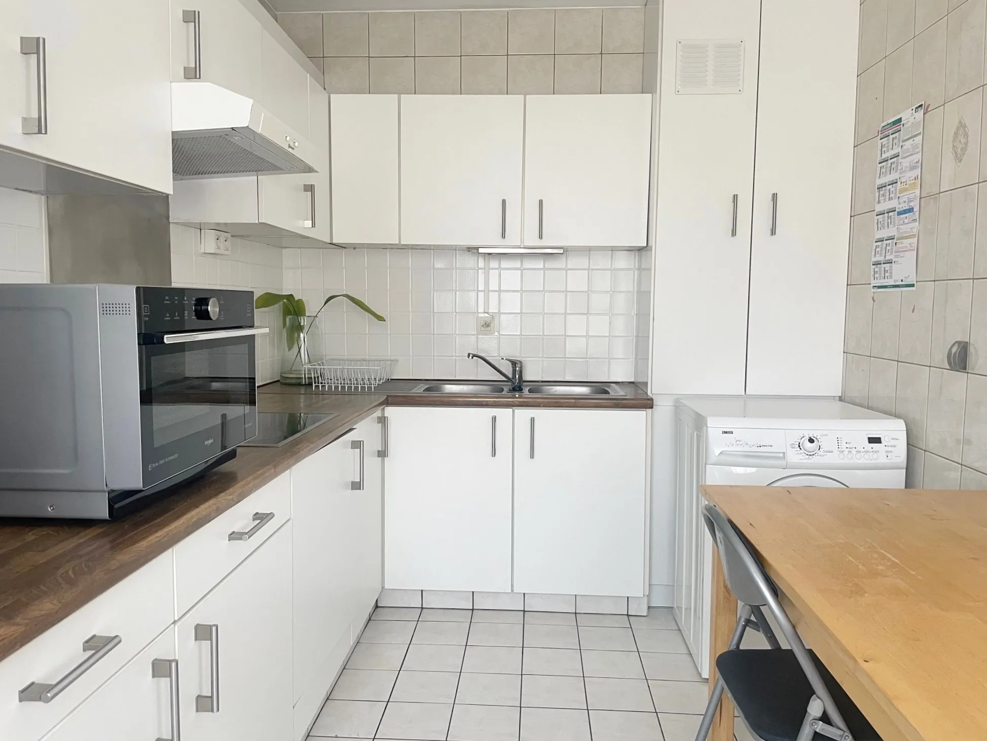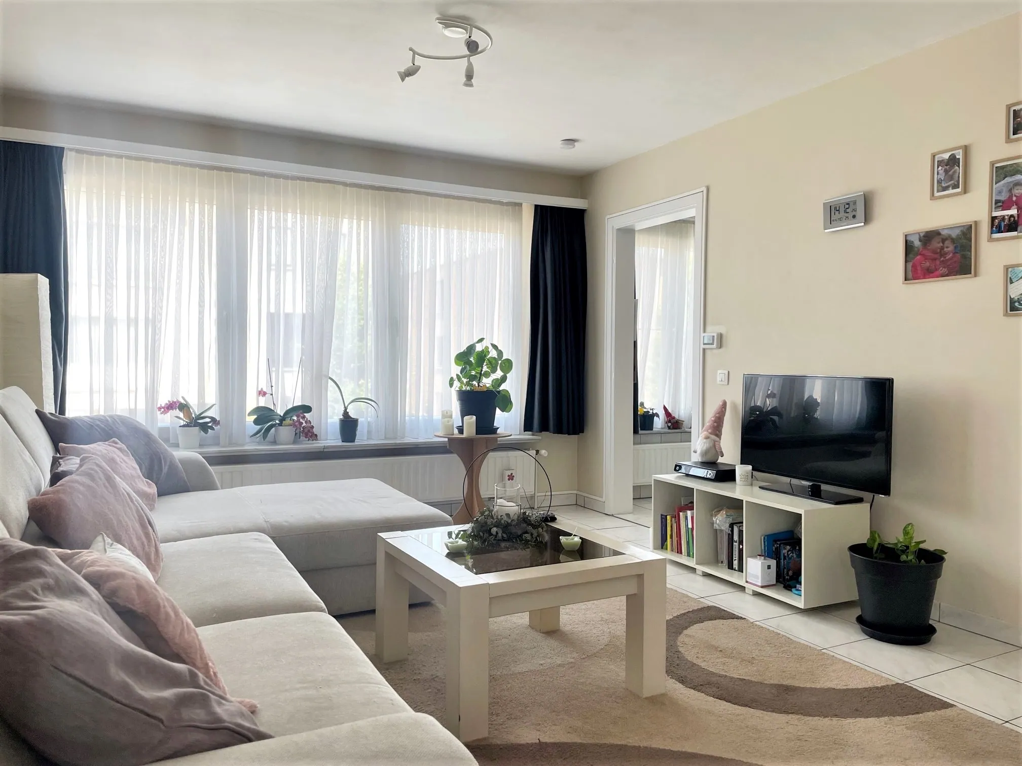 Via de inkomhal stappen we in de woonkamer. Niet alleen is deze verrassend groot, maar heb jeook de vele ramen al gespot? Aansluitend is de keuken. Vernieuwd en praktisch afgewerkt: verrassend veel kasten en alle nodige snufjes zijn aanwezig. Er is zelfs ruimte voor het maken van een gezellig ontbijthoekje. Ook de wasmachine kan je hier kwijt.