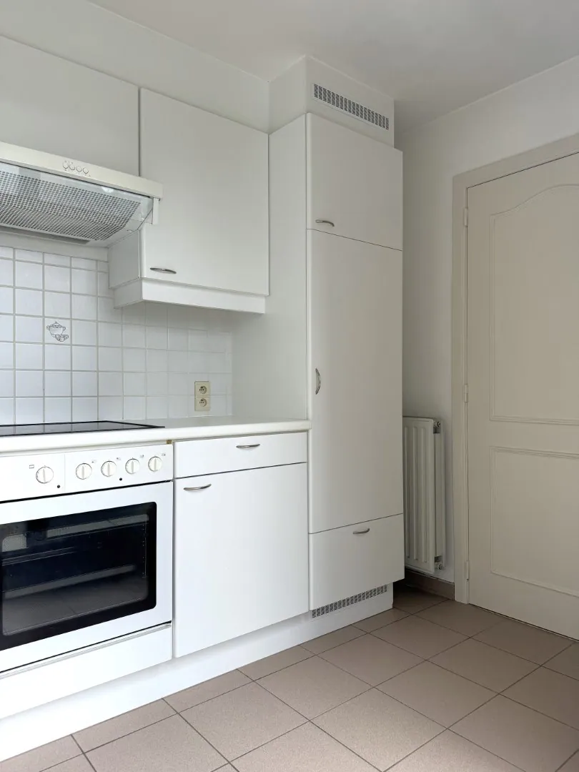 Dé voltreffer van dit appartement? De woonkamer met z’n plafondhoge ramen aan weerskanten! Vanuit je zetel kijk je zo over de stad. Aansluitend is de keuken. Deze is niet nieuw, maar kreeg wel regelmatig een update. Enkel de vaatwasser kan je zelf nog plaatsen.