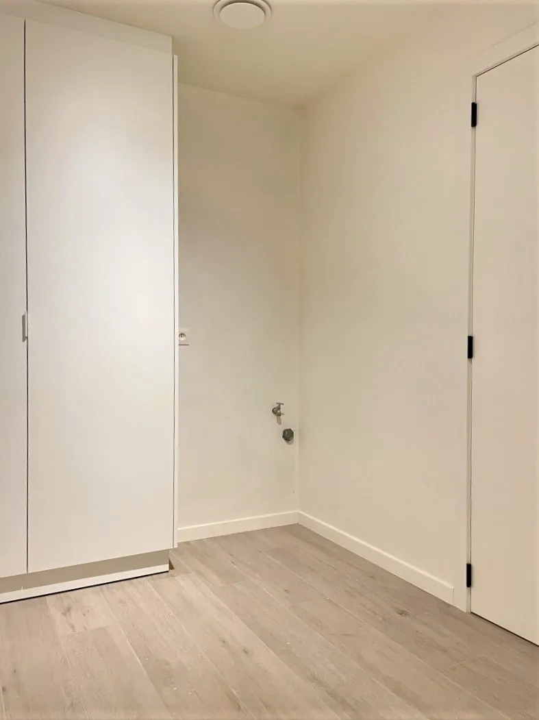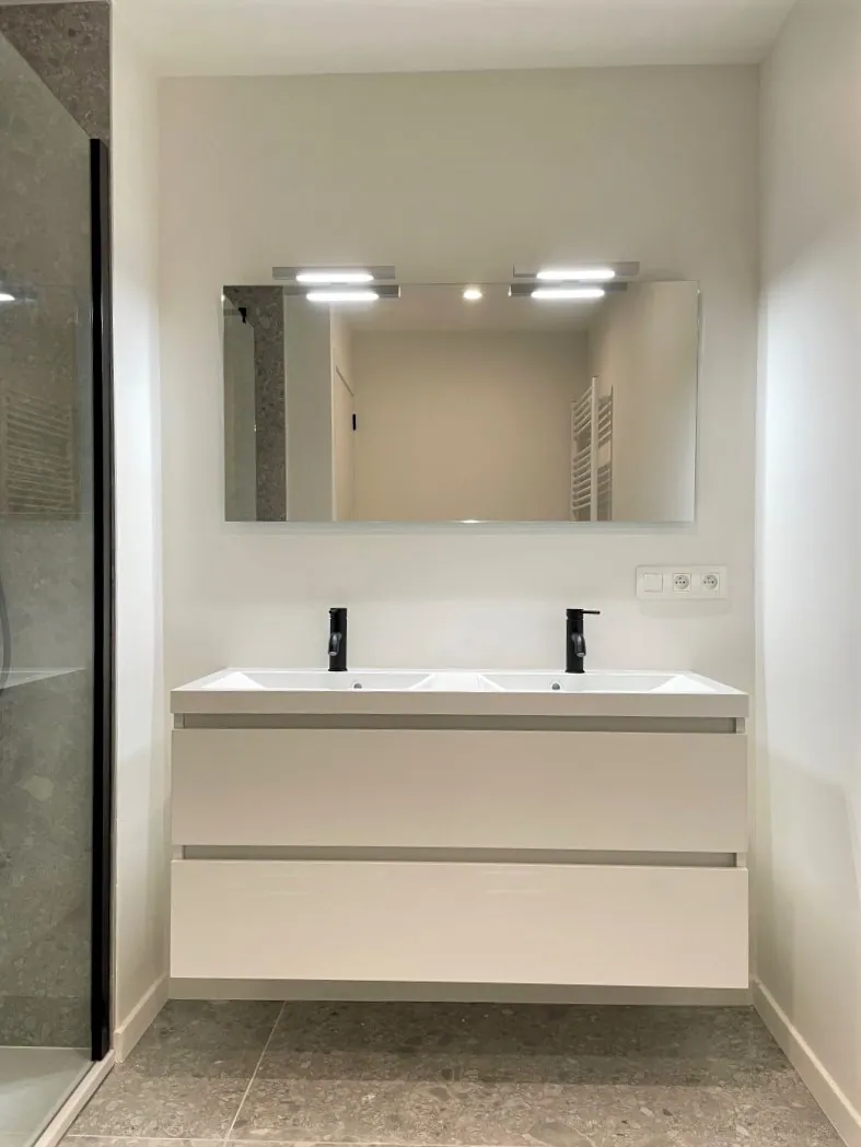 De gang – die trouwens voorzien werd van heel wat ingebouwde kasten – leidt ons dan naar de grote wasplaats – ook voorzien van kasten – en de badkamer. Deze laatste werd opgebouwd met trendy materialen, en omvat een inloopdouche en dubbele ... wastafel. Het toilet is apart.