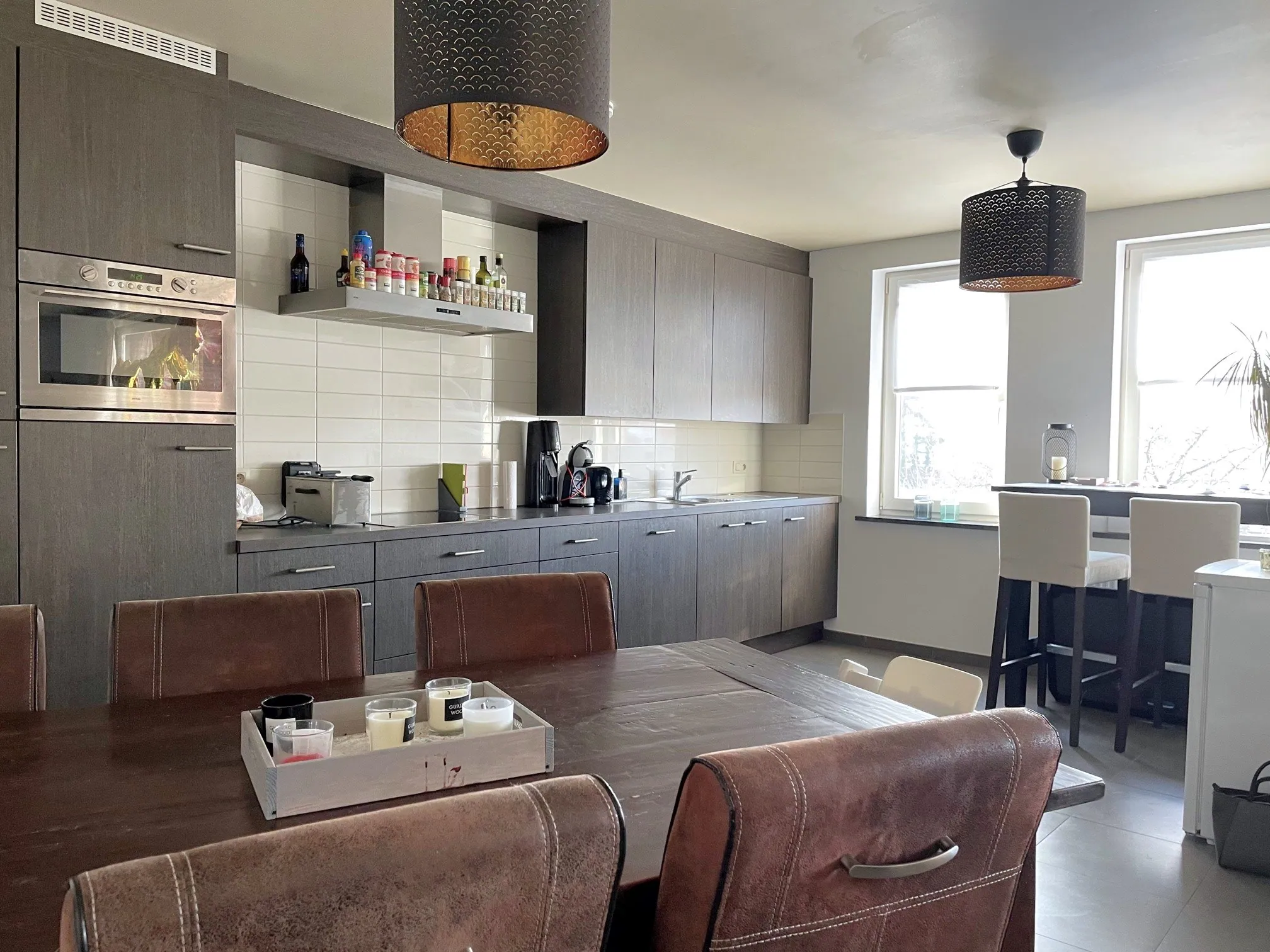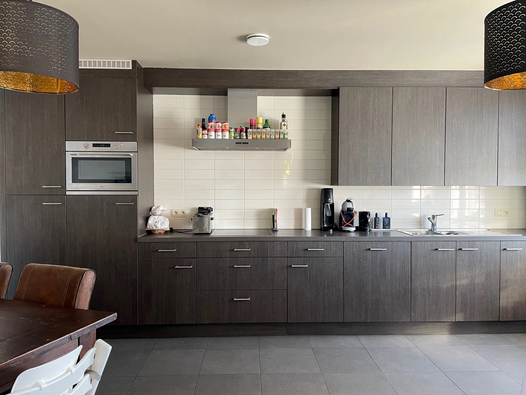 Aan de achterzijde zien we een ruime woonkamer met open keuken, voorzien van alle nodige snufjes én toegang naar het ruime terras. Naast de keuken is nog een grote berging/wasplaats.