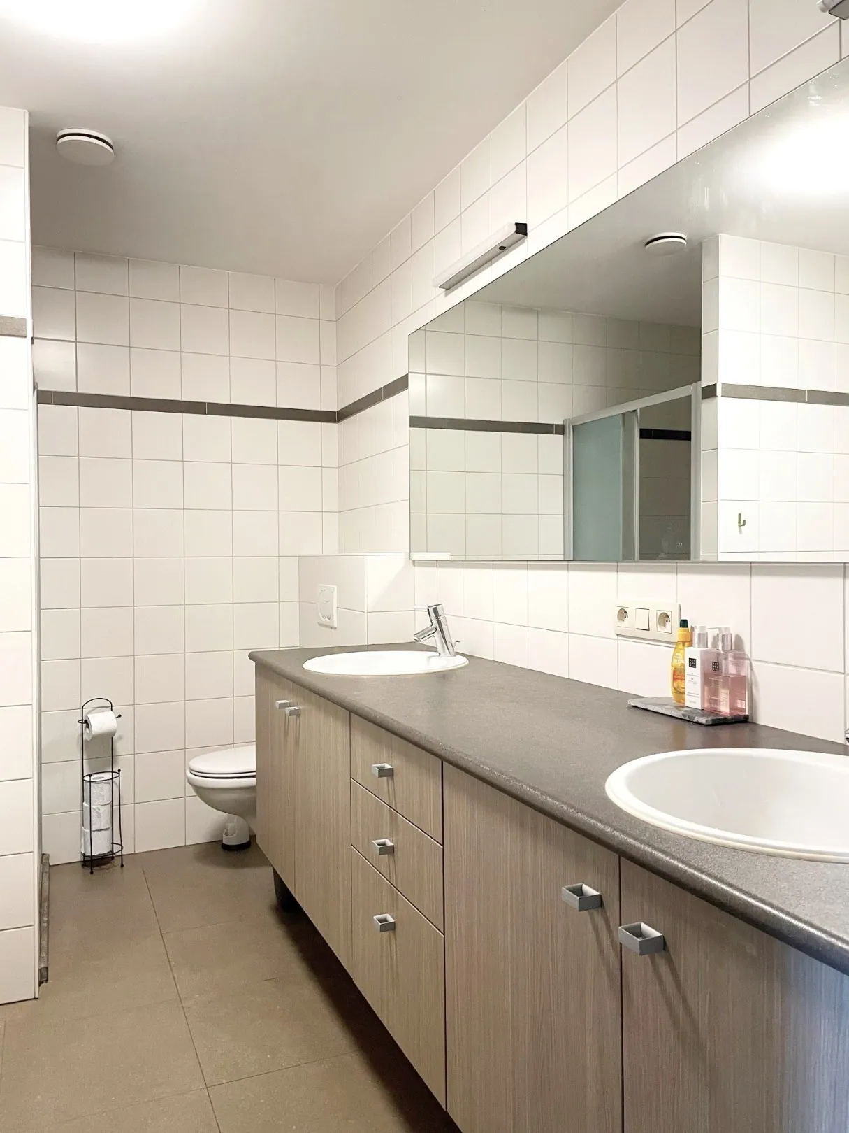 Slapen doen we aan de voorkant, waar 2 slaapkamers voorzien werden. In de badkamer vinden we een bad én douche, badkamermeubel met dubbele wastafel en een toilet.