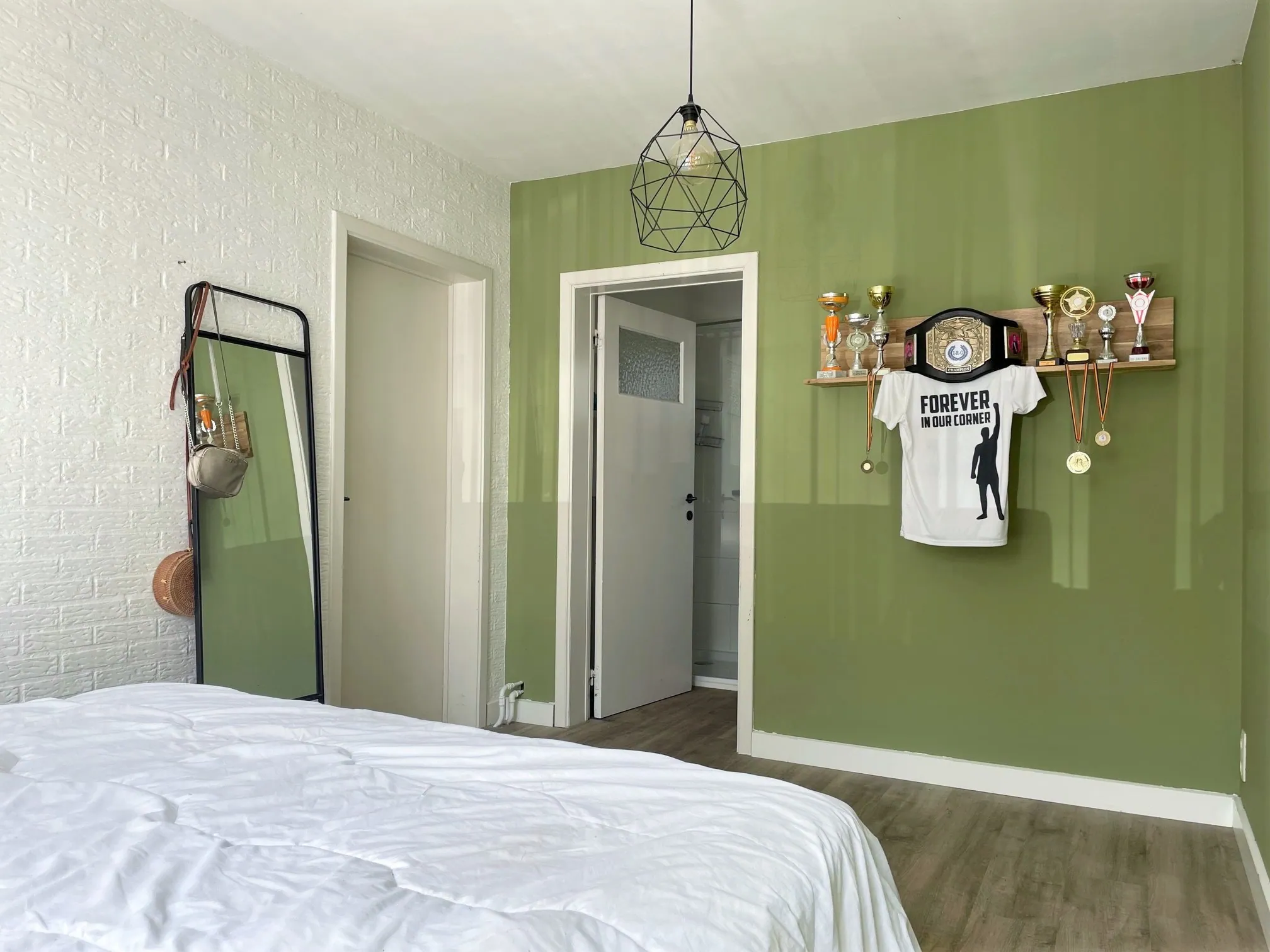 Verder is er een grote slaapkamer, met de badkamer aansluitend. Hier kan je ook je wasmachine en droger netjes kwijt onder het blad van het badkamermeubel. Het toilet is apart.