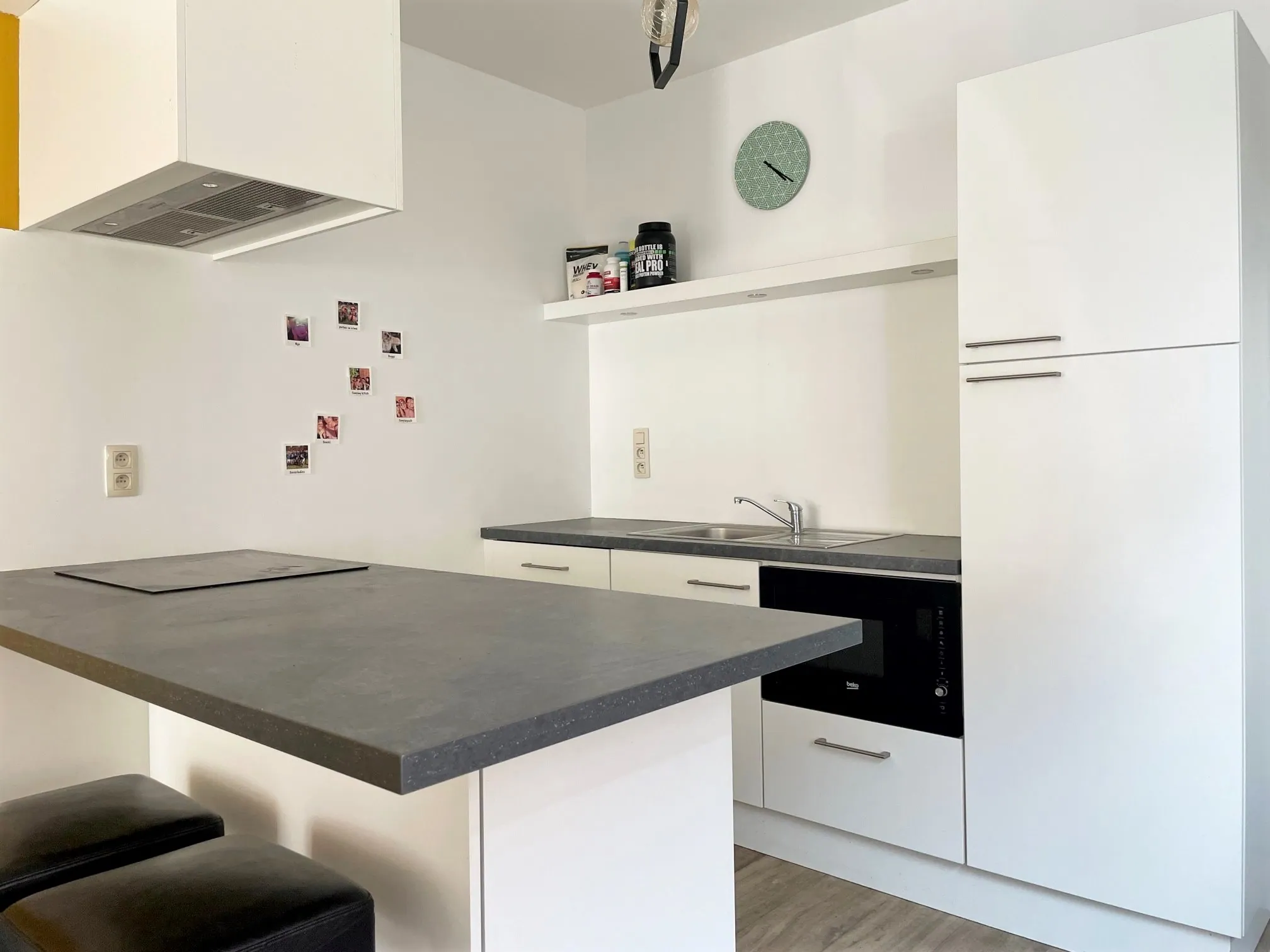 Handig, zo’n eigen inkomhal. Je kan je jassen en schoenen kwijt, en stapt zo de woonkamer in. Check de lichtinval dankzij die grote ramen aan de voorzijde! Aansluitend is de open keuken, voorzien van alle nodige snufjes. Naast de keuken is nog een kleine voorraadruimte.