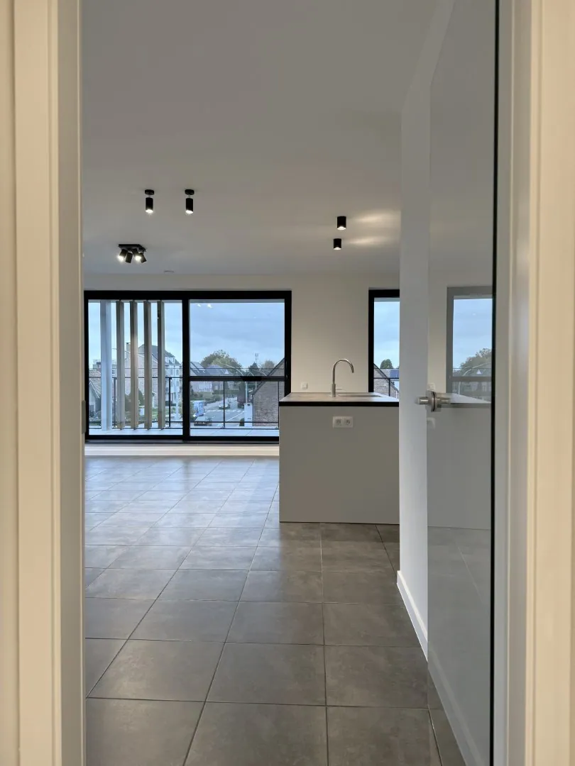 Zullen we beginnen aan het einde van de gang? Want daar zit de woonkamer met keuken. Een open lay-out die nog eens extra in de verf gezet wordt door de grote ramen. De keuken werd trouwens voorzien van alle snufjes. En check aansluitend dat grote balkon! Niet enkel voldoende groot om gezellig je ding te doen, maar ook overdekt (en dus ideaal voor onze Belgische zomers).