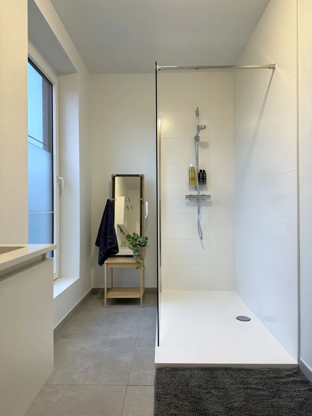 Er zijn 2 slaapkamers. De ene al wat groter dan de andere, en beide werden voorzien van rolgordijnen. De badkamer is clean en licht, met een dubbele wastafel en een grote inloopdouche. Het toilet is dan weer apart.