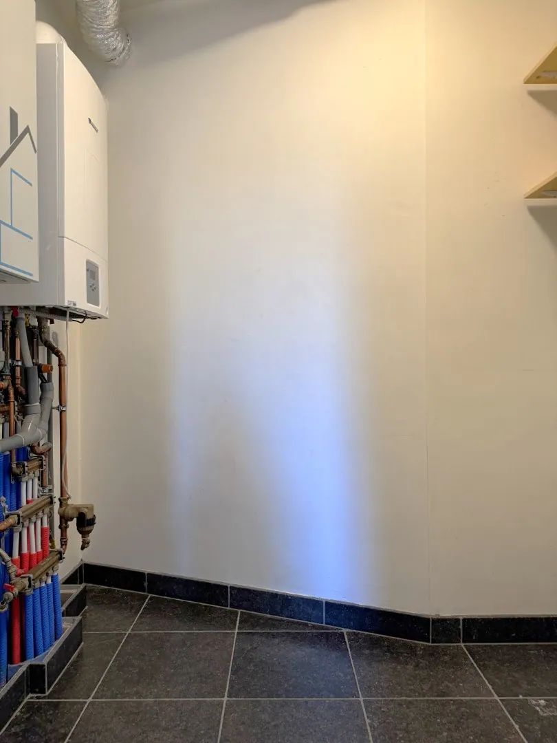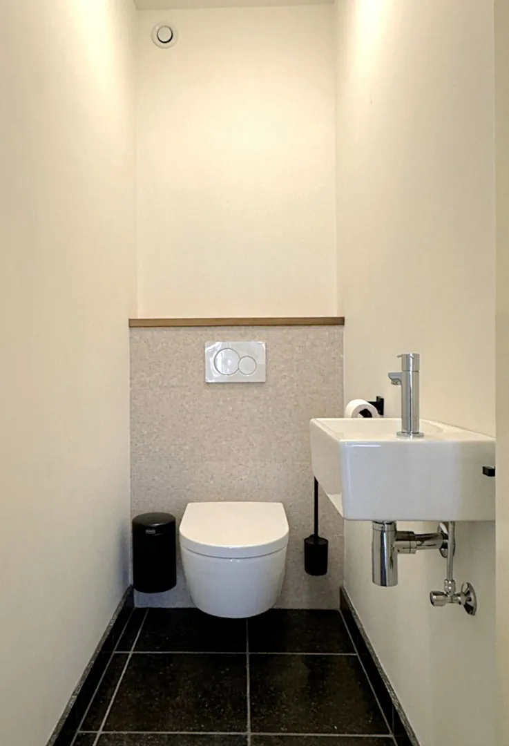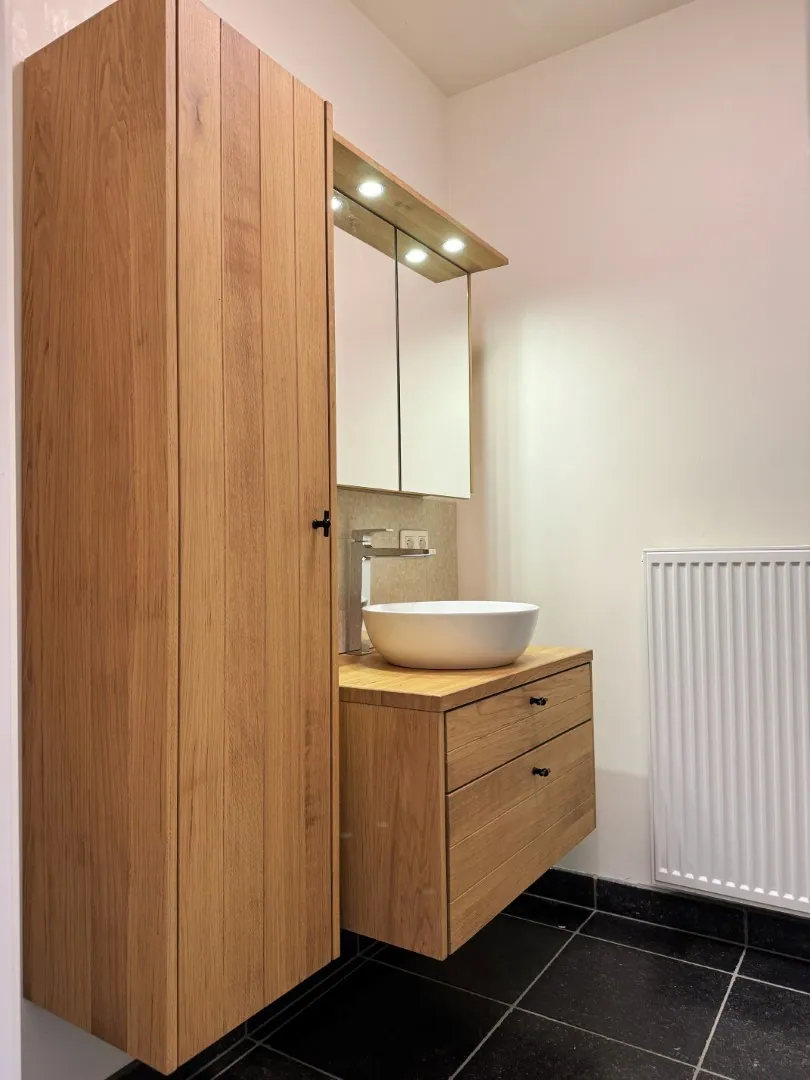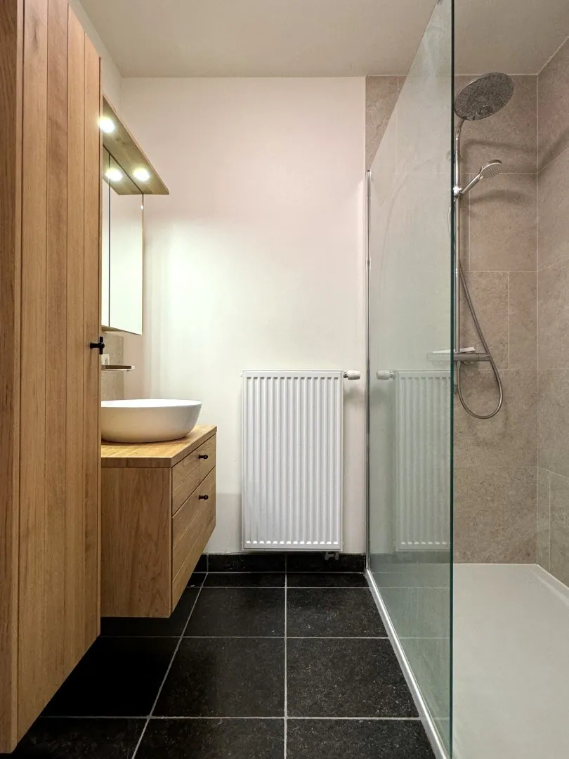 De badkamer is zoals een badkamer moet zijn: clean, overzichtelijk en onderhoudsvriendelijk. Er is een badkamermeubel met heel wat bergruimte, en een inloopdouche. Het toilet is apart.