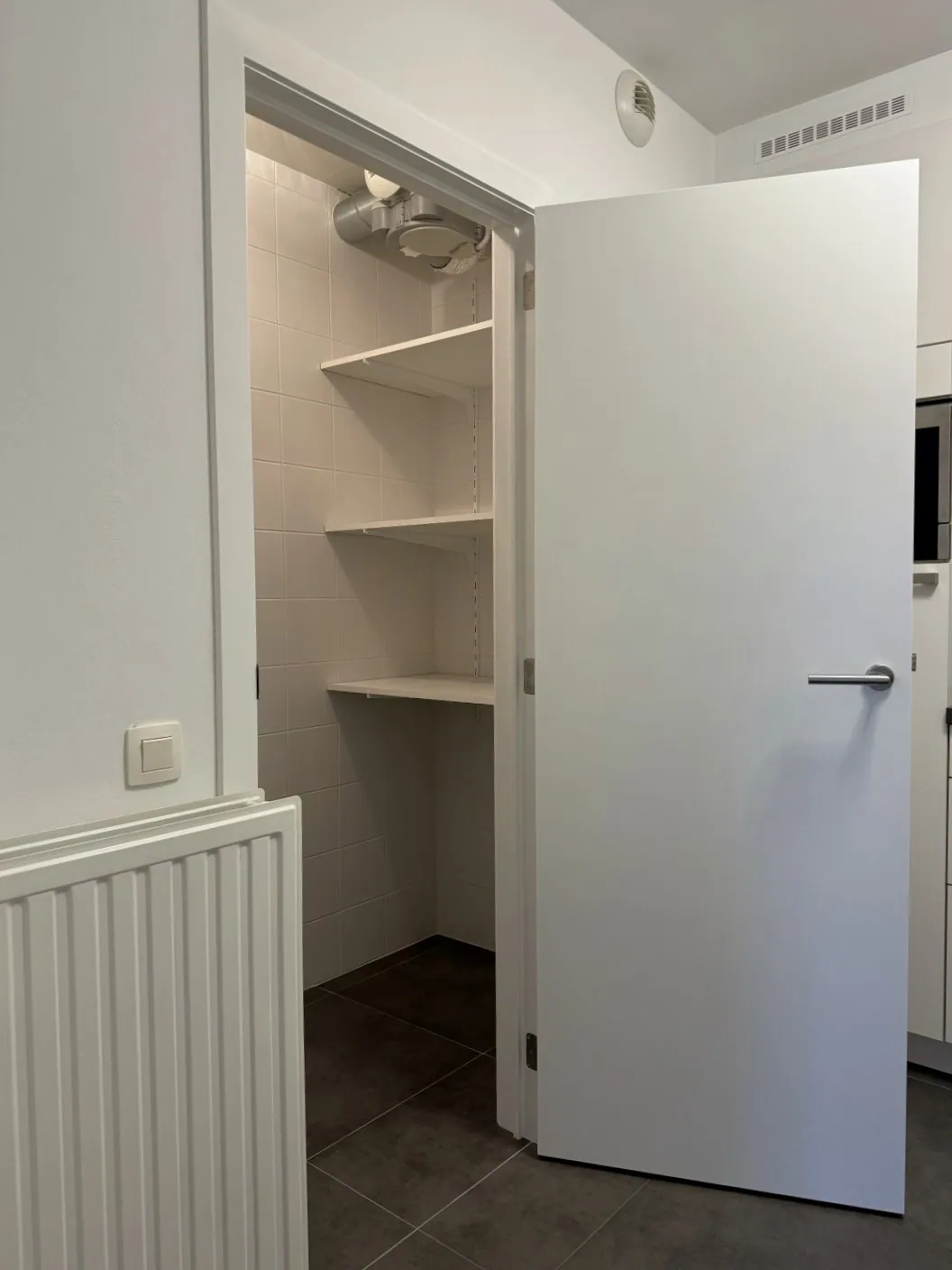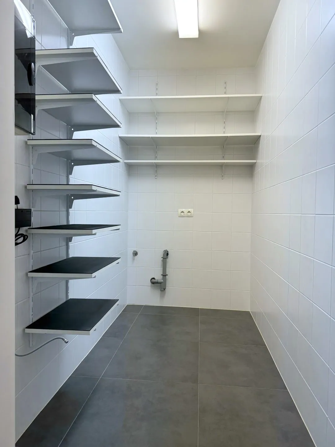 Nog wat rommeltjes die je niet meteen kwijt kan, zeg je? No problemo, er zit nog een tweede (grote) berging. De wandplankjes zitten er al, dus je kan meteen aan de slag. Hier zitten ook de aansluitingen voor wassen en drogen.