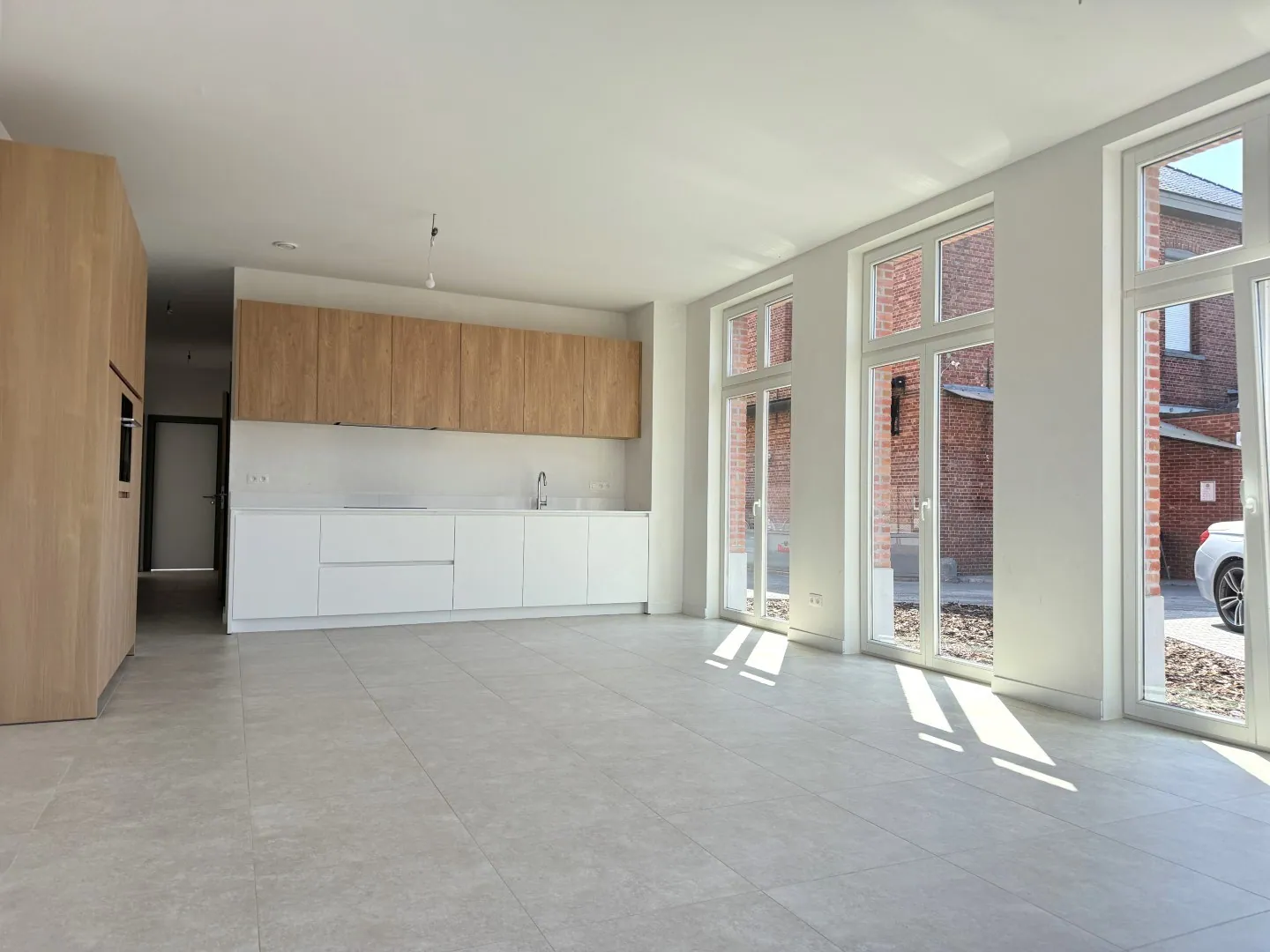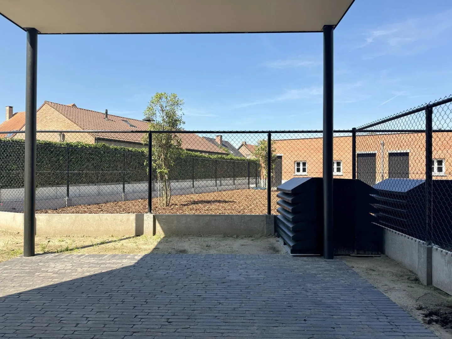 Zullen we beginnen aan de achterzijde? Want van al die ramen word je vrolijk, toch? Héérlijk licht en luchtig, en in de zomer zwier je de schuifdeur open en haal je de zon ... zo binnen…of euh…beter gezegd: laat je het Belgische regenweer lekker buiten. Want hoera: een (deels) overdekt tuintje!