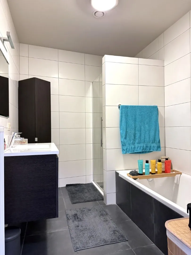 Aan de voorzijde van het appartement merken we 2 slaapkamers, voorzien van rolluiken. De badkamer is lekker praktisch, want er werd – ... naast een badkamermeubel – zowel een douche als bad geplaatst. Er is tenslotte een apart toilet.