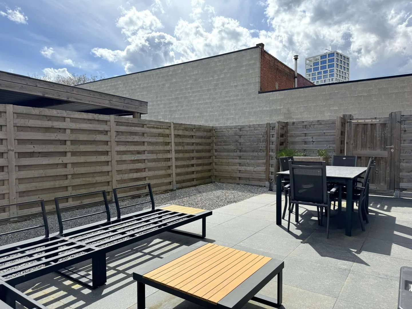 De tuin werd volledig verhard, en is dus lekker onderhoudsvriendelijk. Een fijn plekje om buiten te zitten, zonder elke zondag de grasmaaier boven te moeten halen.