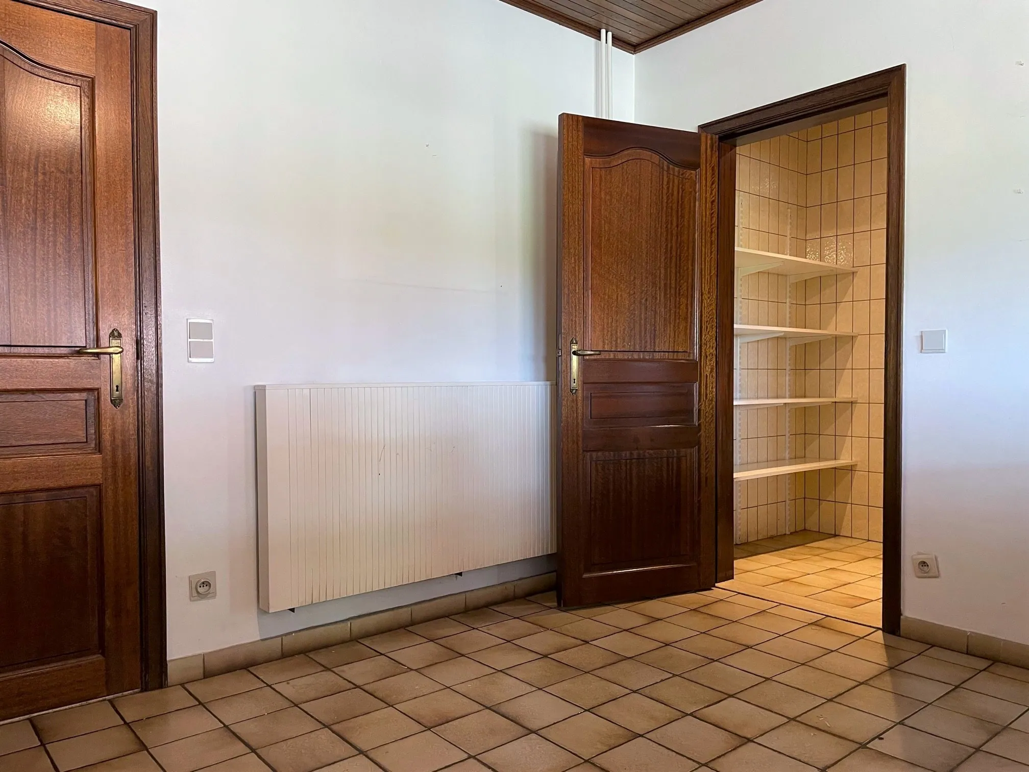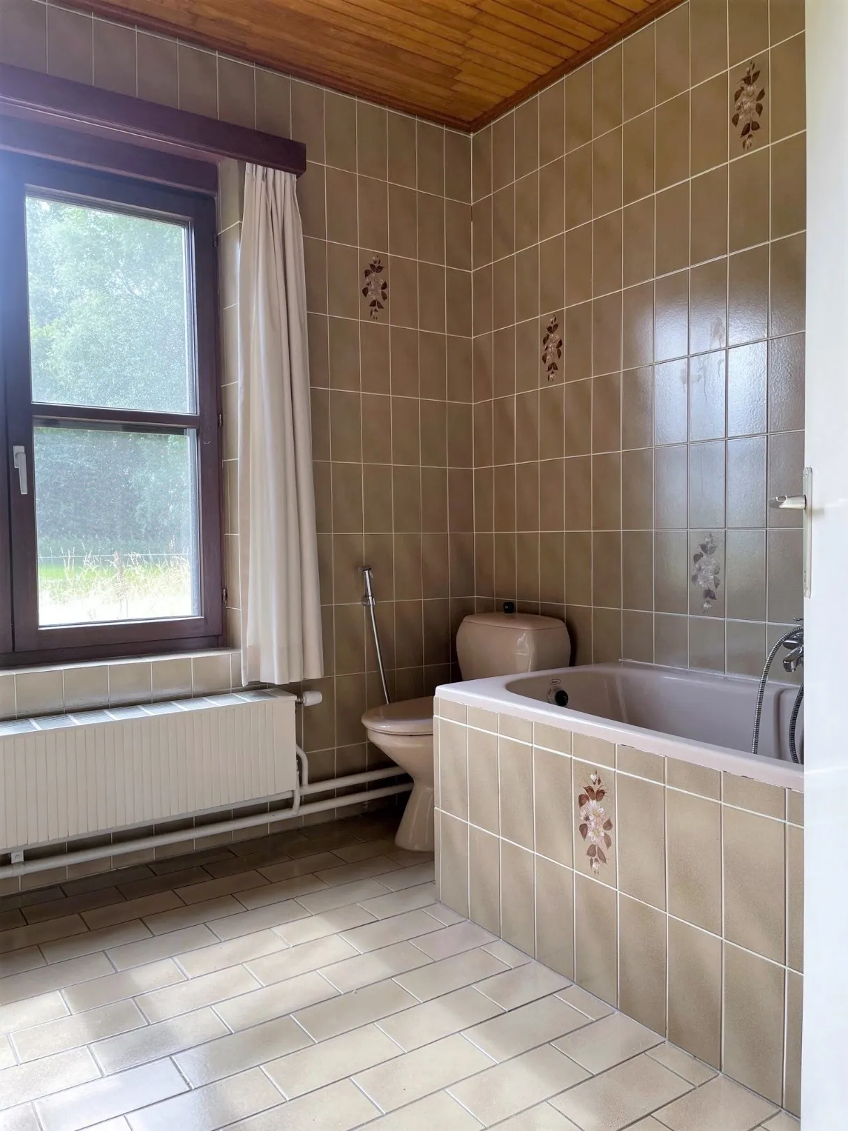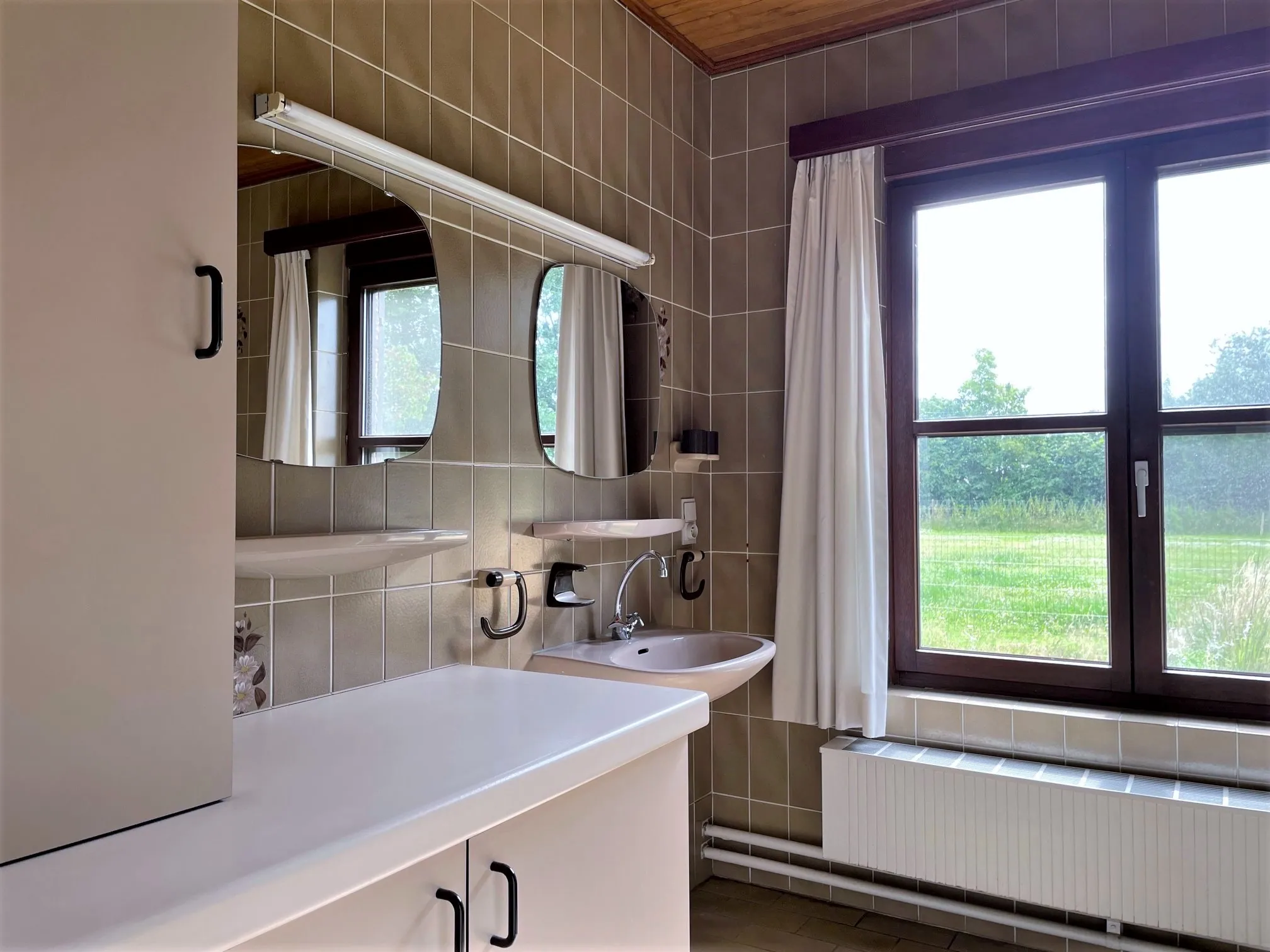 Verder is er nog een wasplaats, gastentoilet en een technische ruimte. Aan de andere kant van het huis zijn 3 gelijkvloerse slaapkamers en 2 badkamers. Niet nieuw, maar goed onderhouden. En…een badje nemen met zicht op je paarden. Of alpaca’s. Of schapen. Of een halve dierentuin. De weide is alleszins groot genoeg.