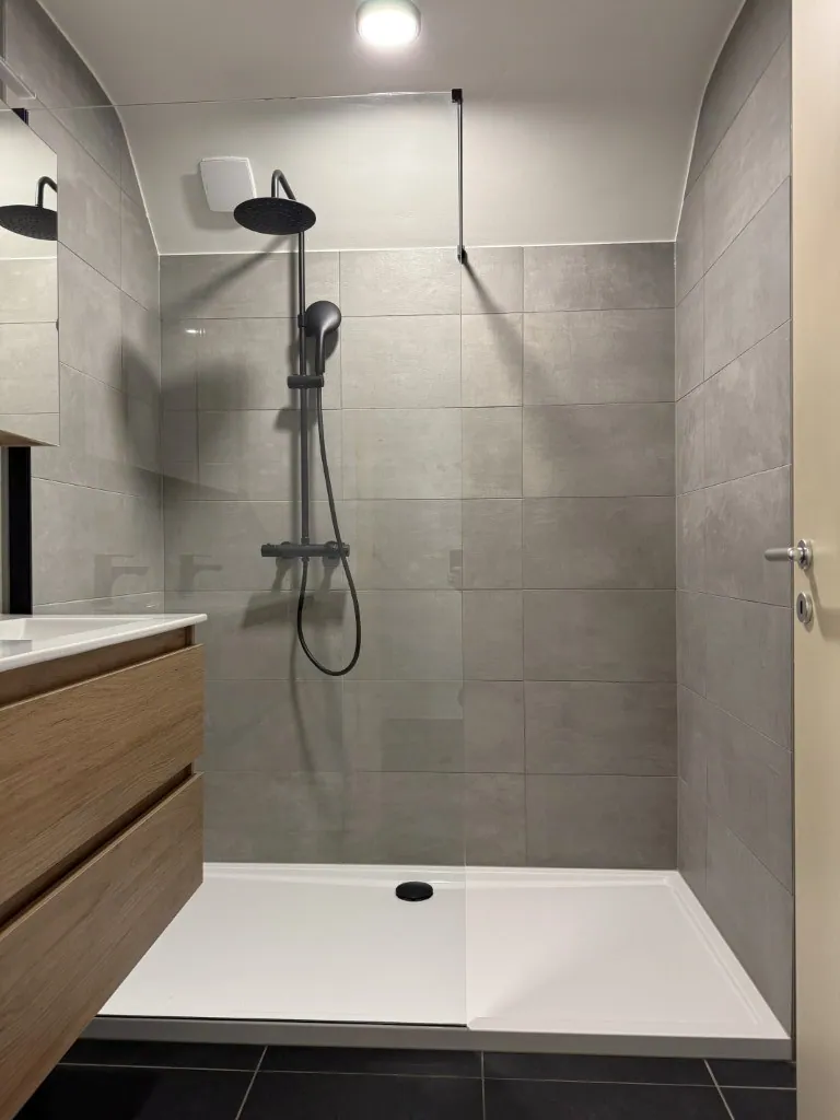 Verder vinden we op deze verdieping 2 slaapkamers en een badkamer. Die laatste werd voor jou nét volledig vernieuwd, dus je kan letterlijk heerlijk clean starten. Het toilet is dan weer apart.