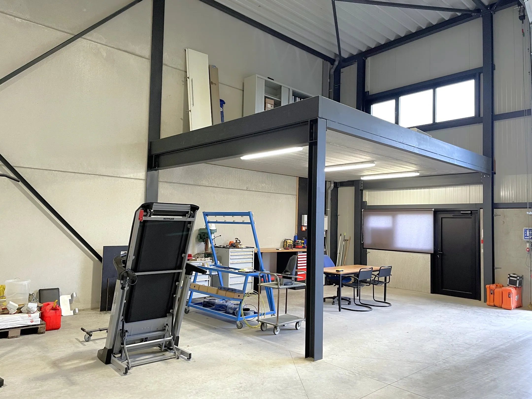Een grote, open ruimte, dus geschikt voor meerdere doeleinden. Op of onder de verdieping kan je een kantoorruimte inrichten naar wens – plaatsing trap bespreekbaar. Verder is ze erg gemakkelijk toegankelijk dankzij de grote toegangspoort. Leveren via (of opslaan van) grote bedrijfsvoertuigen? Ideaal!