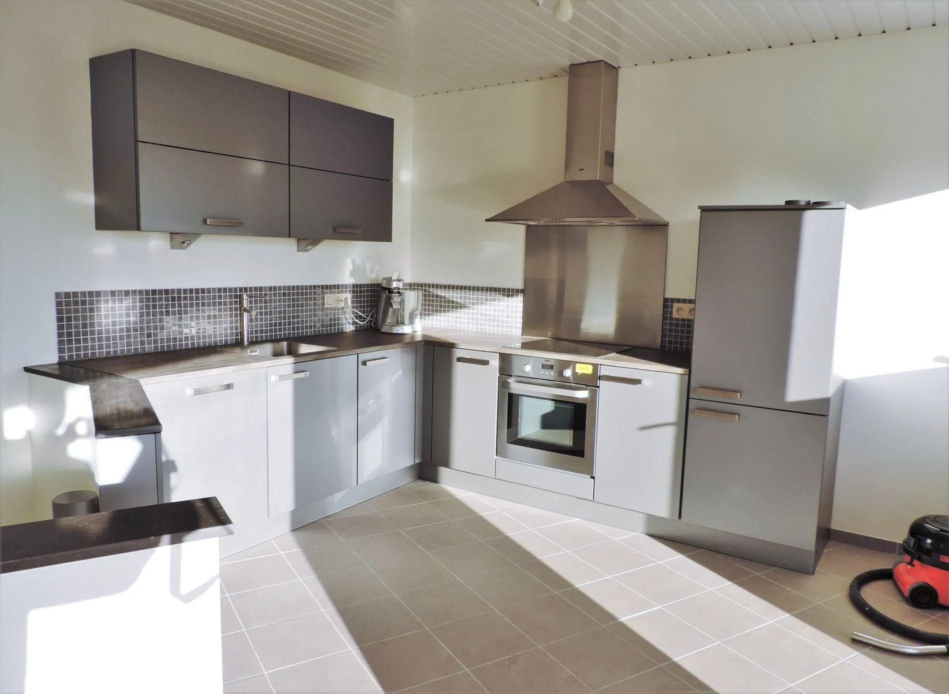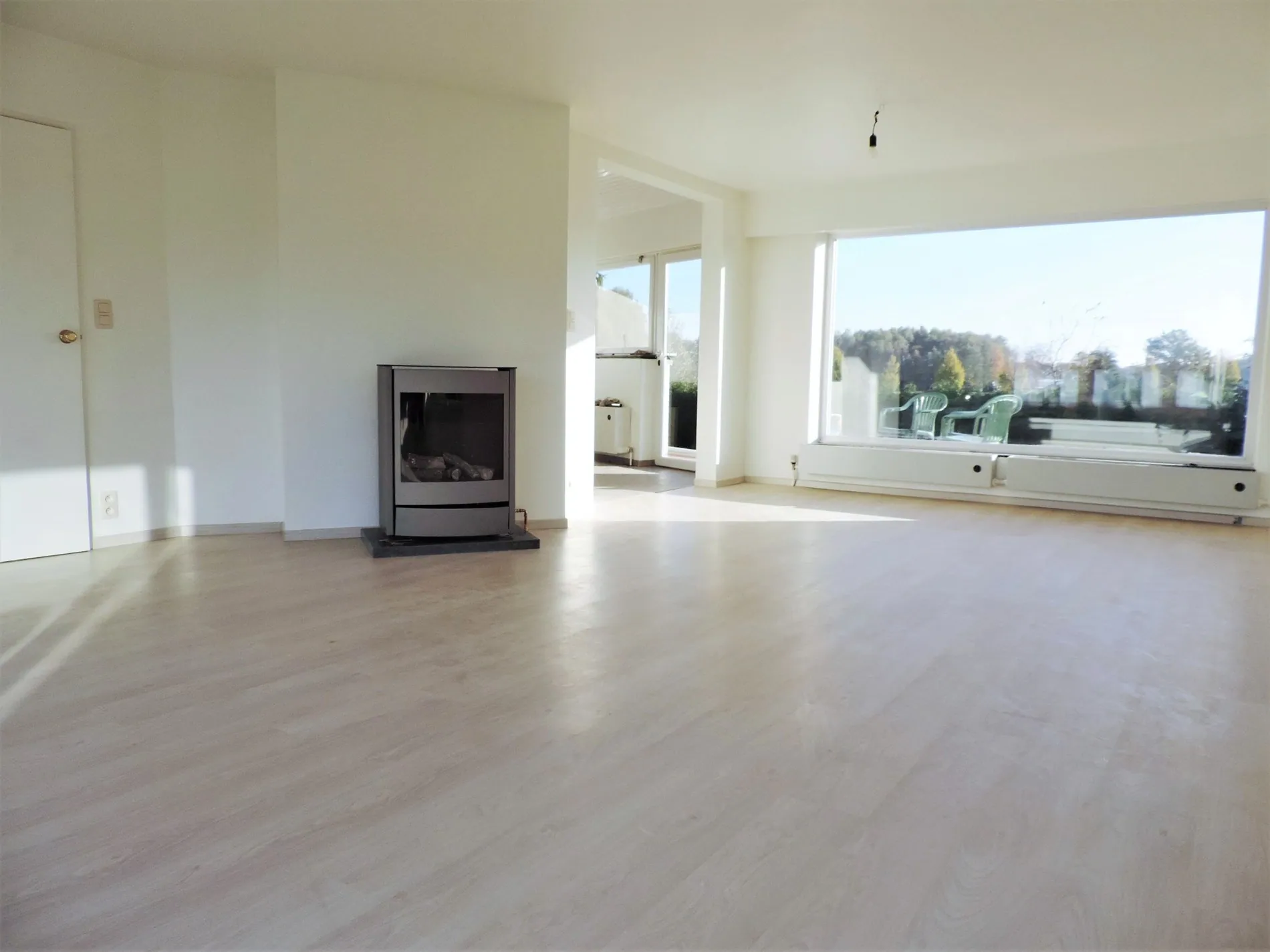 Wat een woonkamer! Niet alleen is ‘ie extra sfeervol dankzij de gezellige gashaard, maar check ook die énorme ramen. Omdat het huis wat hoger gebouwd werd, heb je een heerlijk zicht op ‘t omringende groen. Aansluitend vinden we de keuken. Niet té groot, en voorzien van alle snufjes.