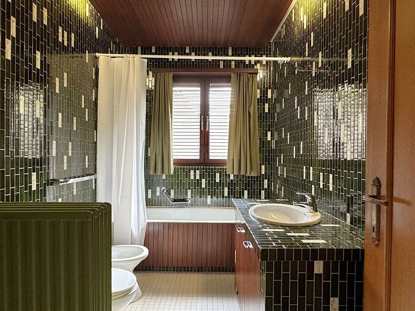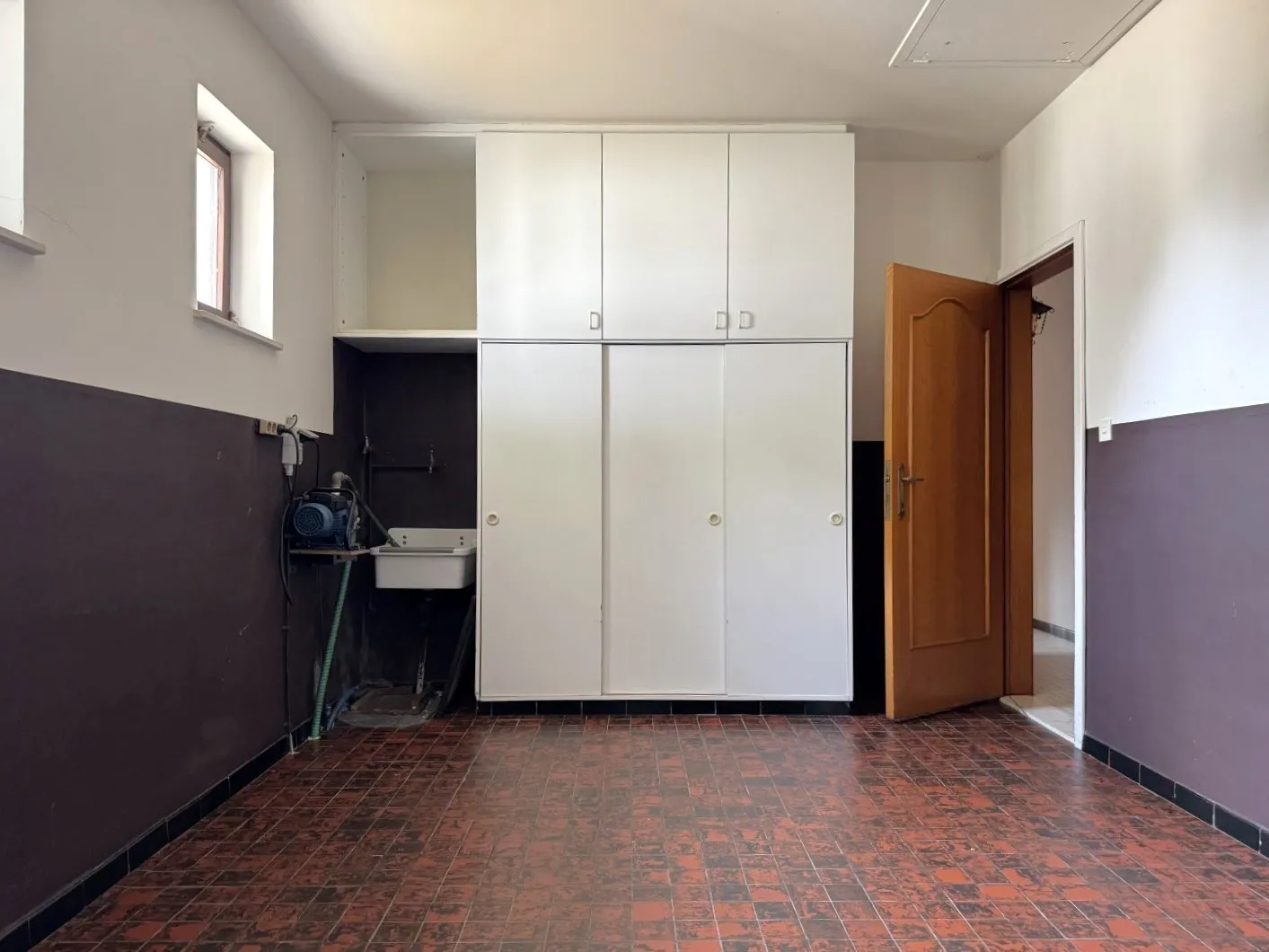 Er zijn 2 slaapkamers gelijkvloers, waarvan de master voorzien werd van een grote kastenwand. Ook de badkamer zit beneden, en is met een bad (incl. douche), wastafel, toilet, bidet en de aansluiting voor de wasmachine. Er is nog een gastentoilet apart.