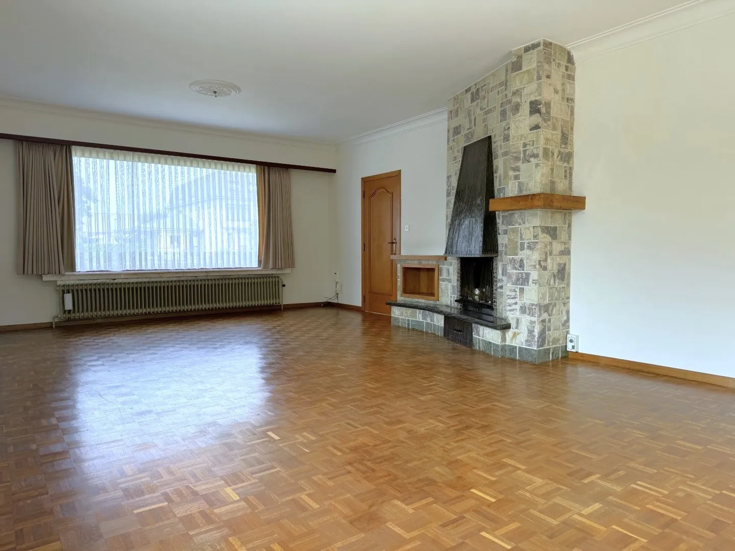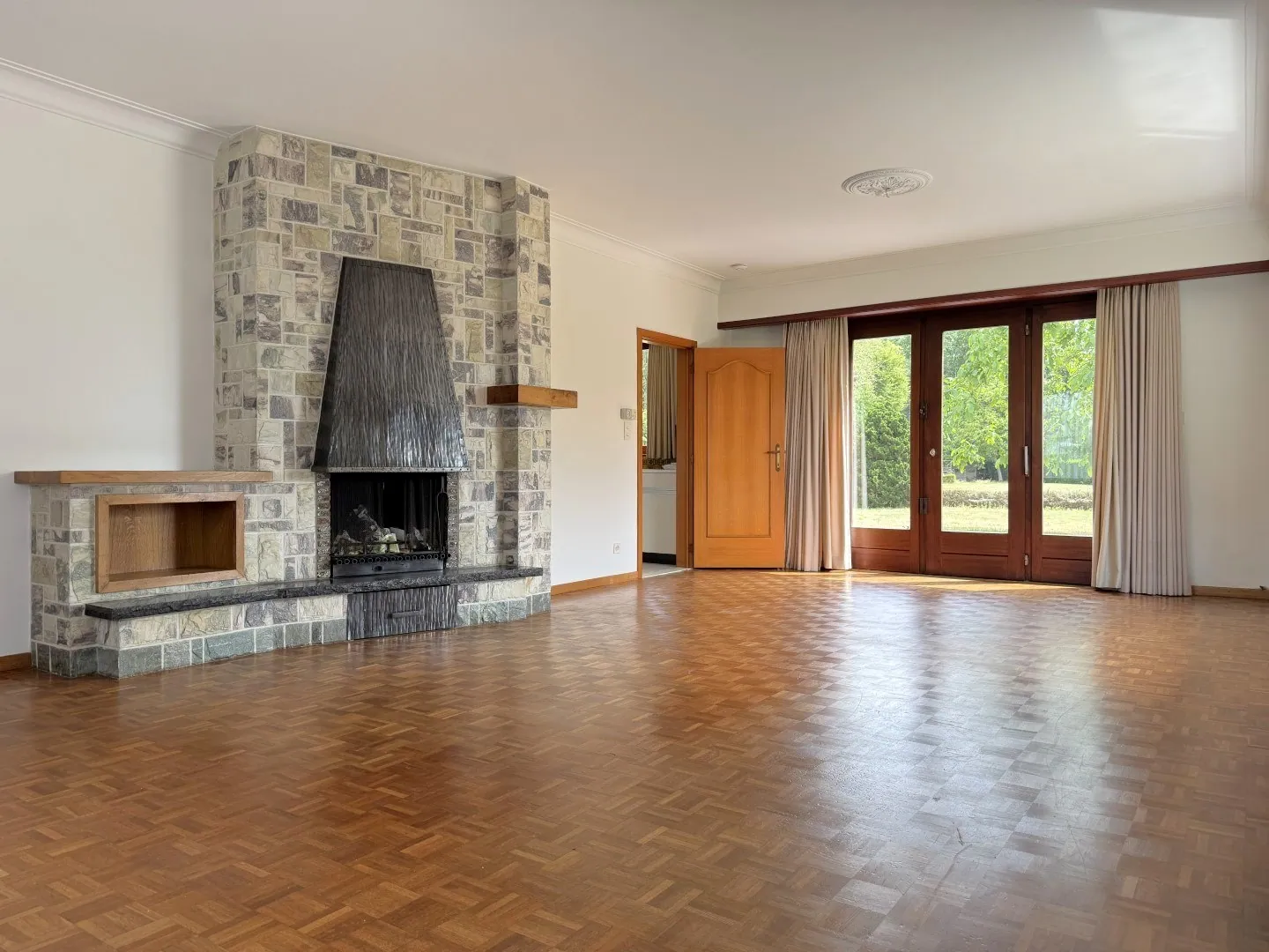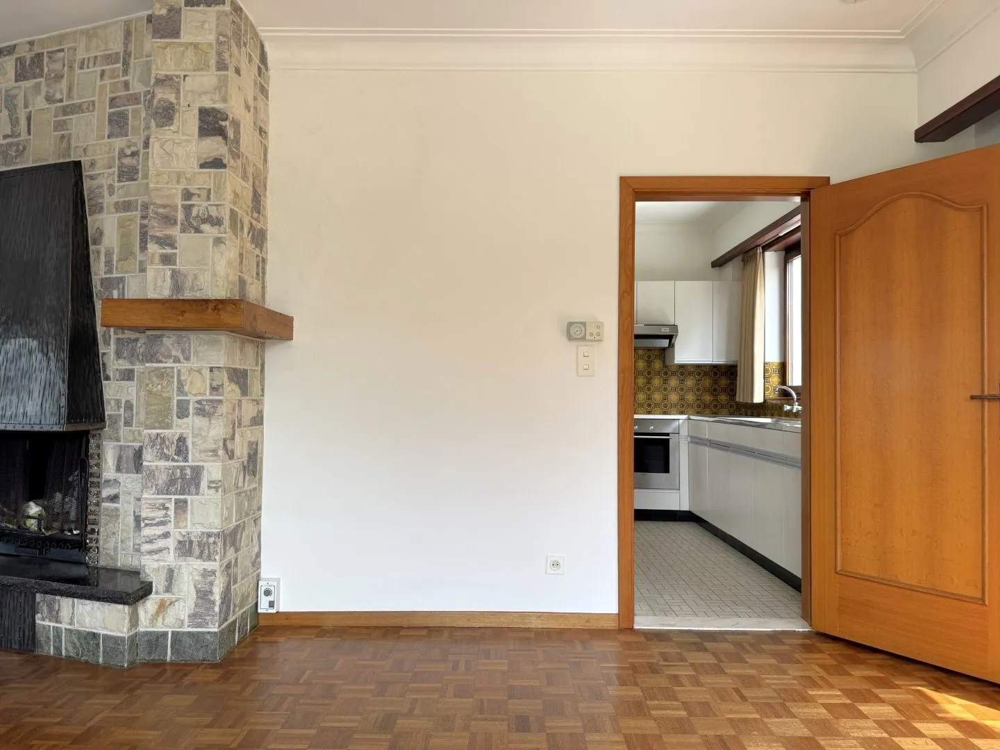 Aansluitend vinden we de woonkamer. Geen living voor de liefhebber van clean en strak, maar een voltreffer als je fan bent van warm en gezellig. Heb je de knappe parketvloer en de openslaande deuren naar ... de tuin gespot? Verder zien we de keuken. De seventies spatten er van af, maar dat zorgt net voor het karakter, toch? De toestellen werden vernieuwd, dus de keuken kan zeker nog een rondje mee.