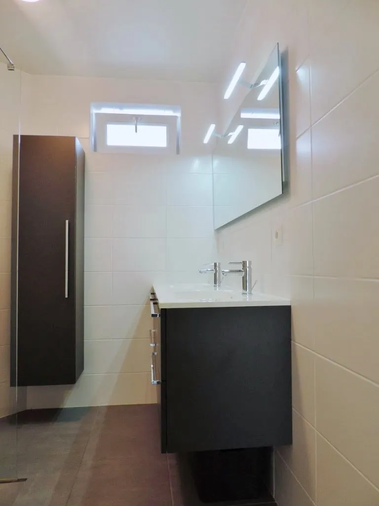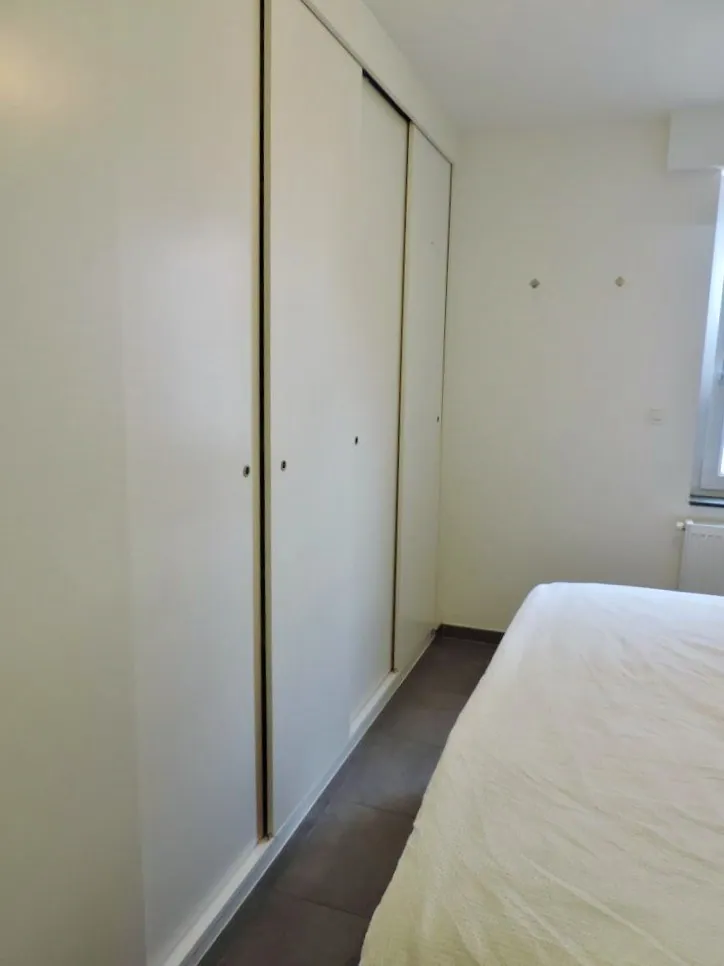 Er zijn 2 slaapkamers aanwezig. Een tikje compact, maar erg praktisch ingericht. De grootste werd voorzien al voorzien van een kastenwand. Verder de onderhoudsvriendelijke badkamer met douche, dubbel wastafel en een extra kast. Het toilet is apart.