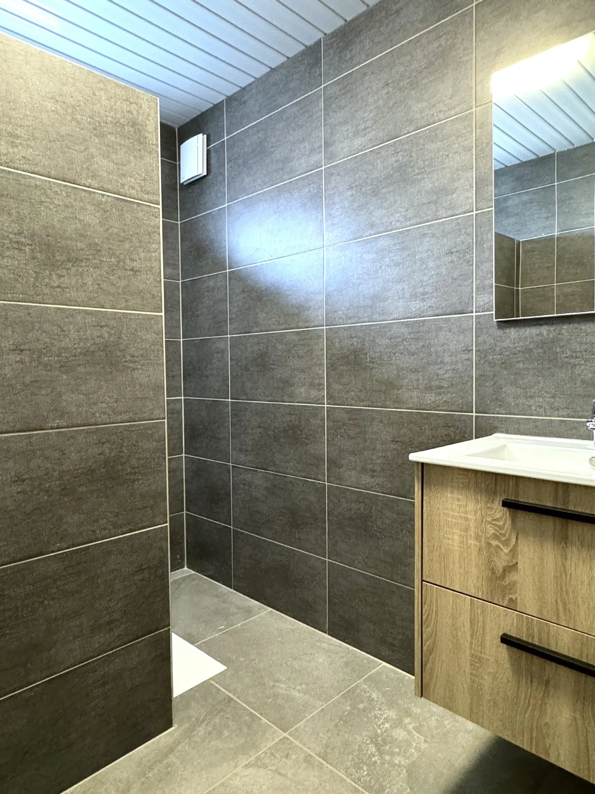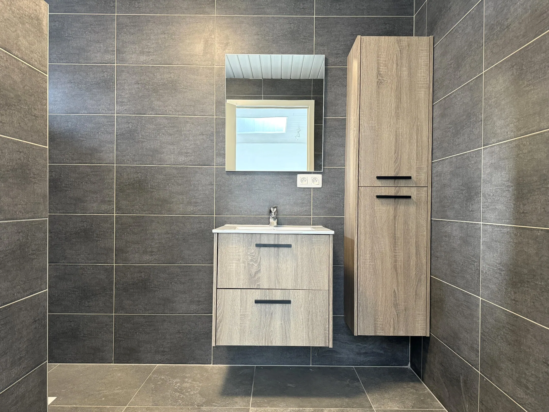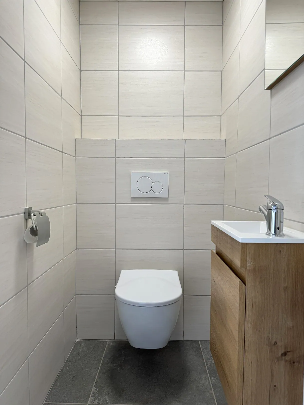 Ook de badkamer kreeg een make-over, en ... werd voorzien van grote inloopdouche en badkamermeubel. Het toilet is apart.