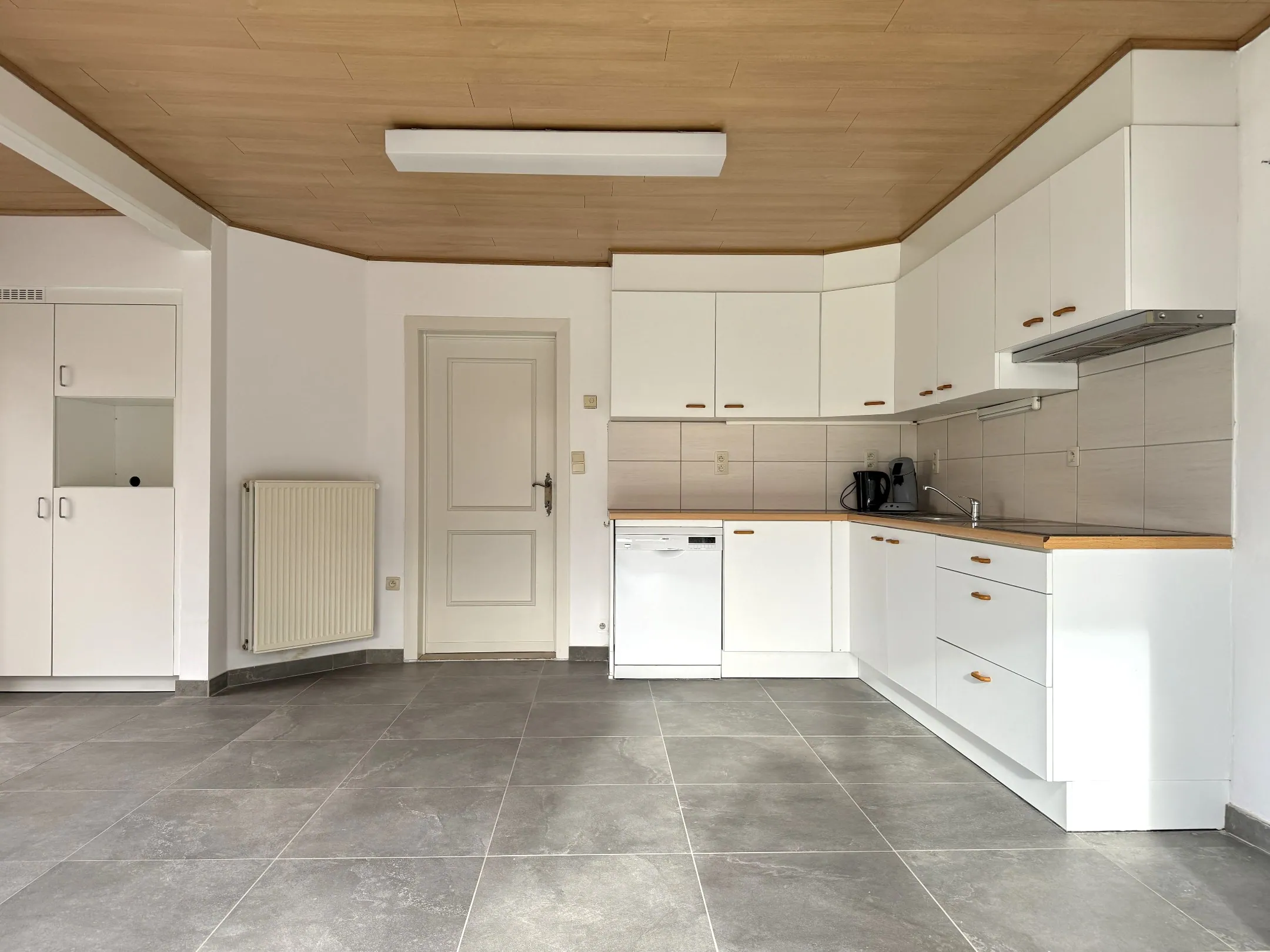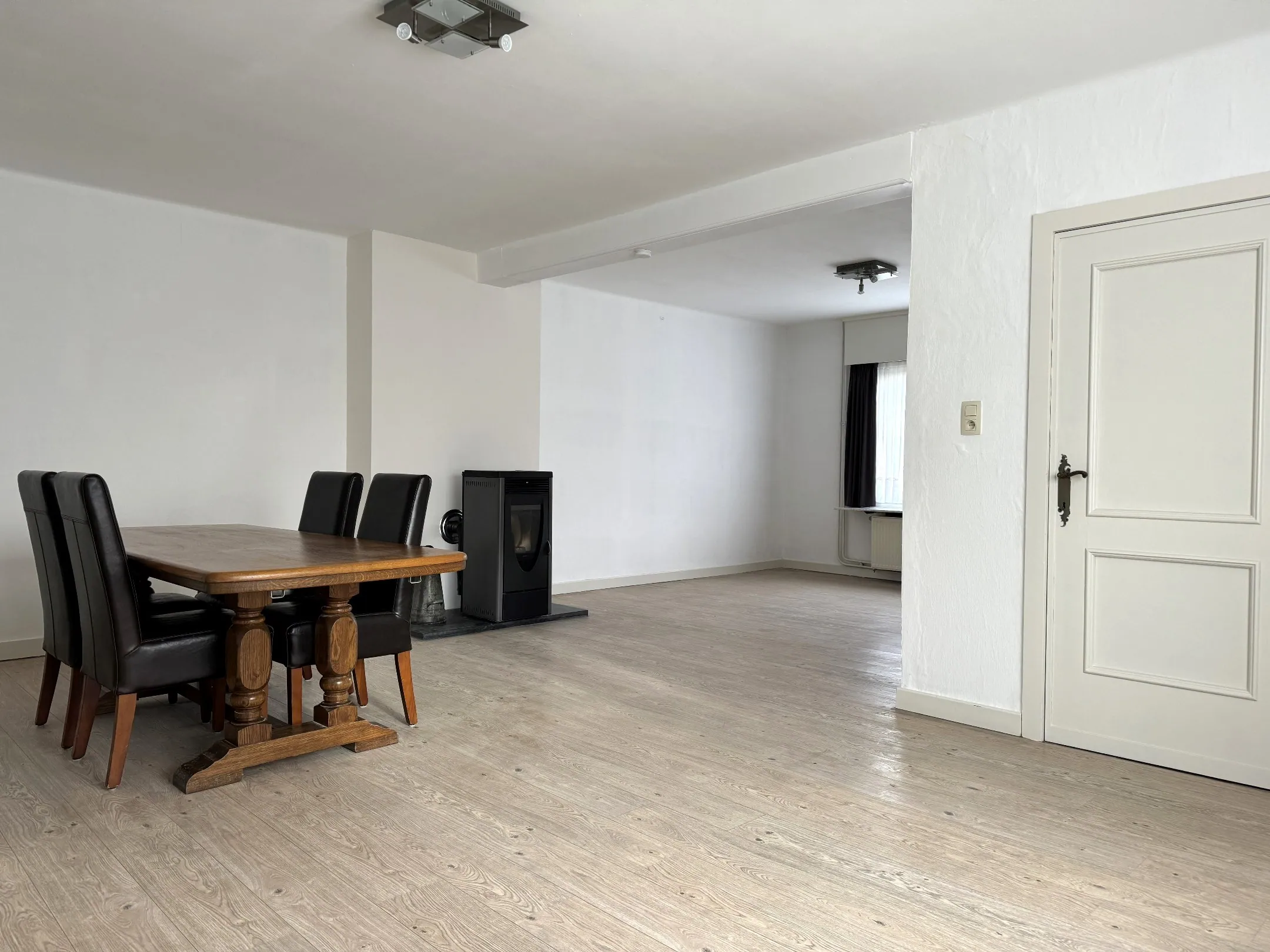 Via de inkomhal stappen we binnen in de verrassend grote woonkamer. Want wat vroeger 2 kamers waren, werden omgevormd naar 1 grote leefruimte. Jep, er is inderdaad centrale verwarming in de volledige woning, maarrrr de pellet kachel zorgt voor extra sfeer (en een goedkopere gasfactuur, hoera!). Aansluitend komen we in een balzaal van een keuken. Een lekker lichte ruimte waar héél het gezin (incl. de koude kant) gemakkelijk rond tafel kan.