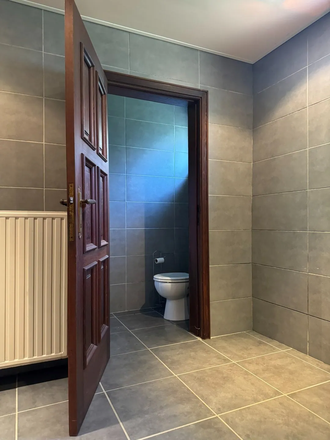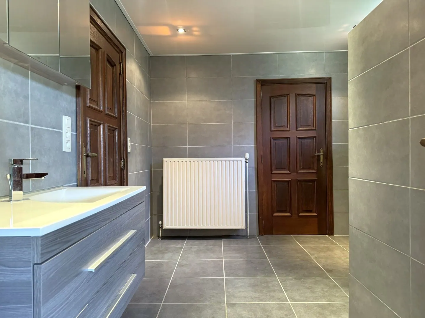 De badkamer werd een tijdje geleden in een nieuw jasje gestopt, en is voorzien van een douche, dubbele wastafel en een toilet. Om de hoek zit nog een (apart) gastentoilet.