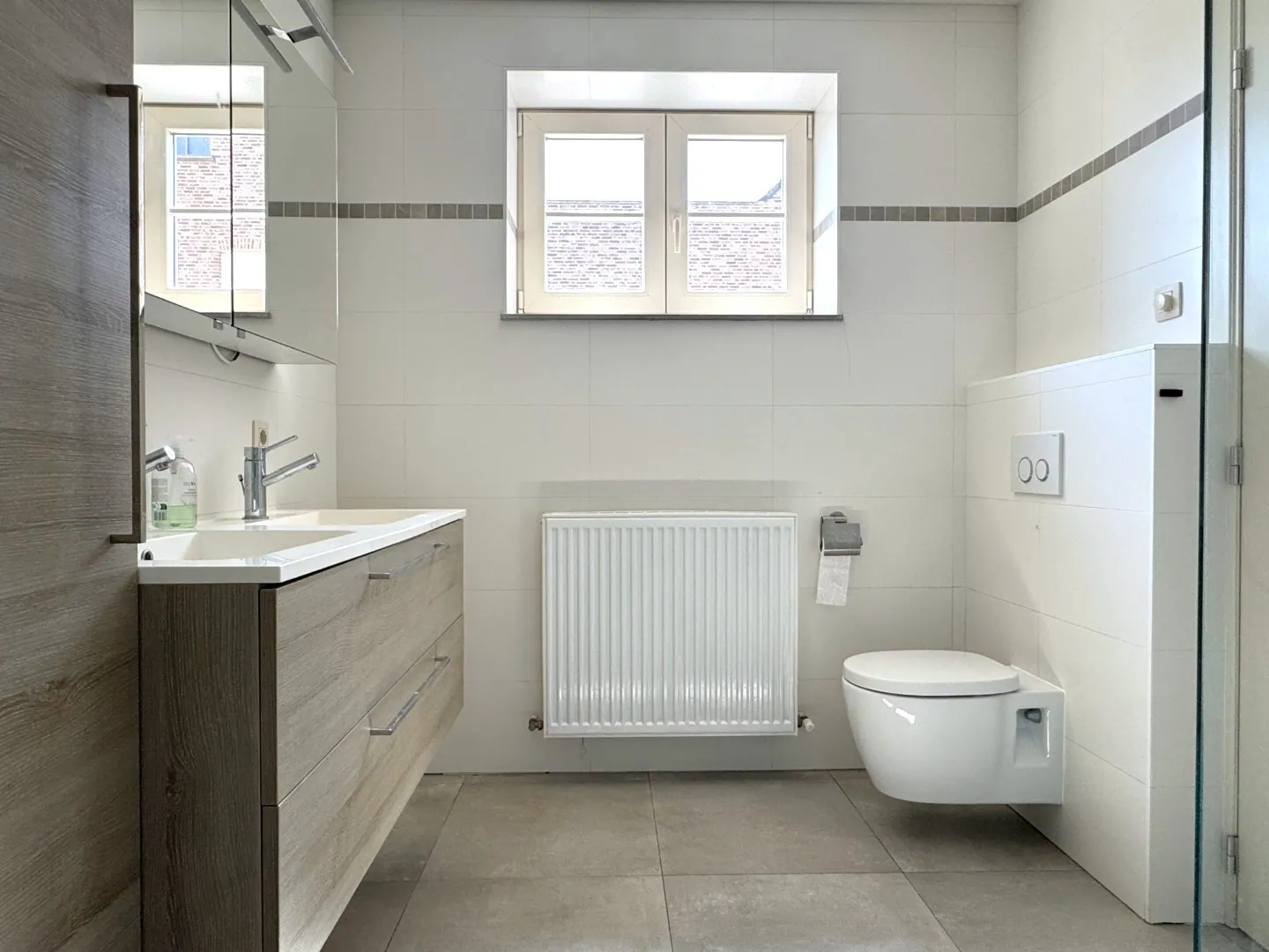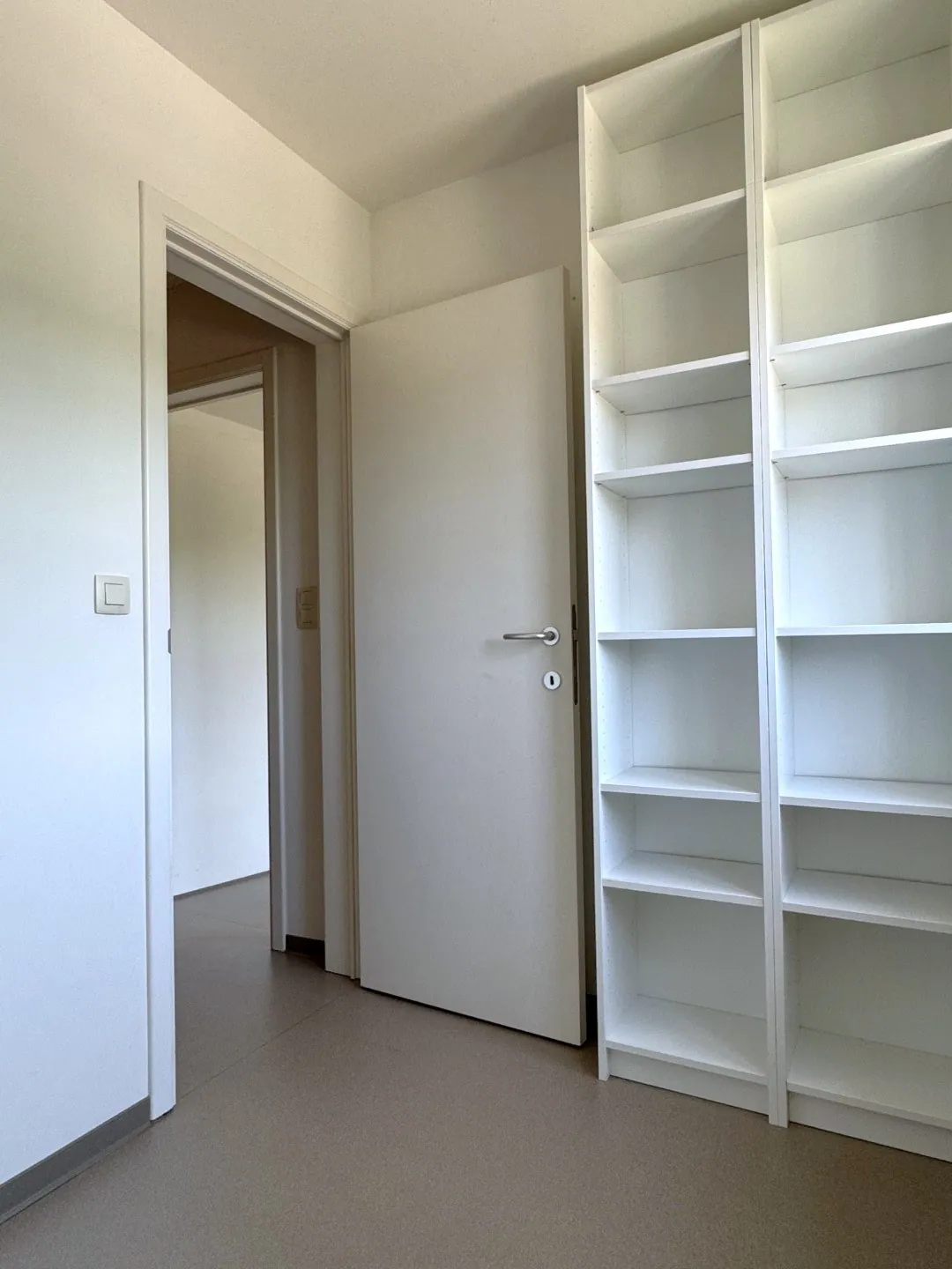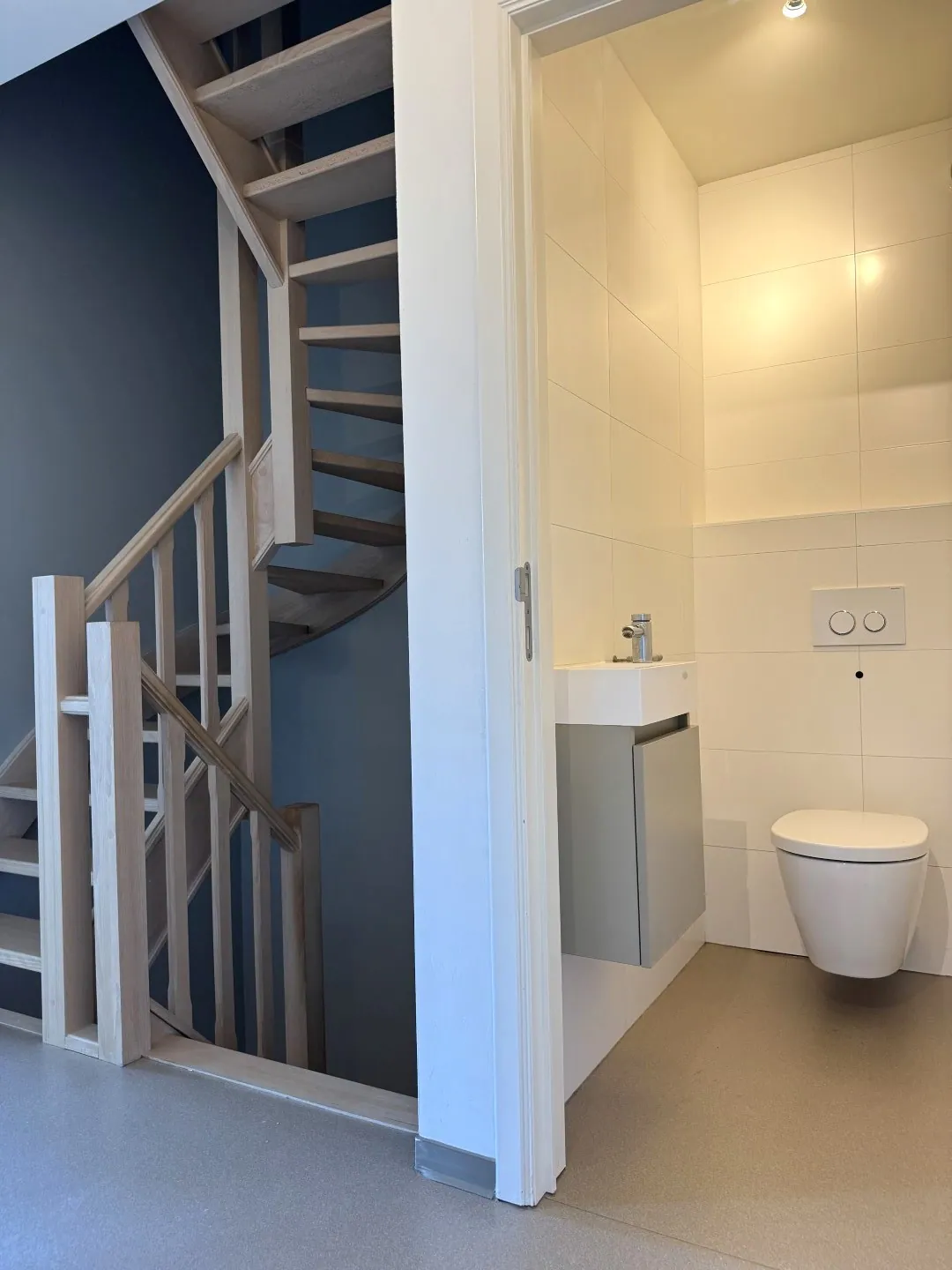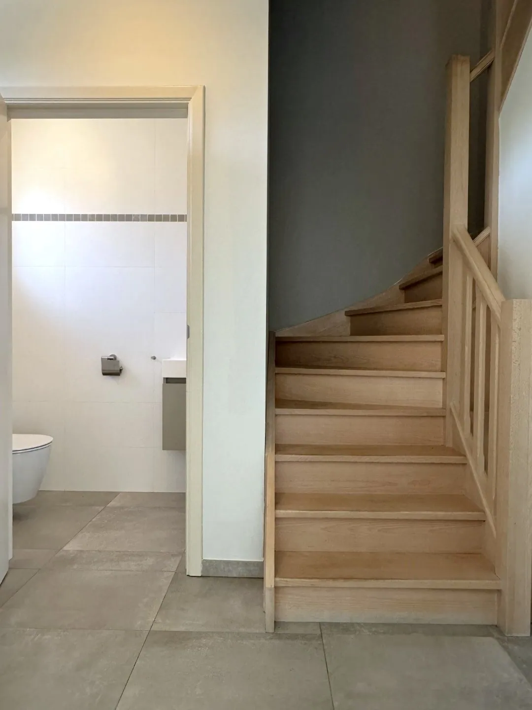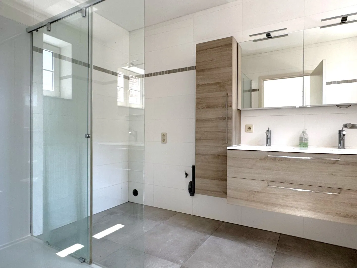 Aan de achterzijde vinden we nog de achterinkom met vestiaire, en aansluitend de badkamer. Deze is voorzien van een inloopdouche, wastafel en een toilet.