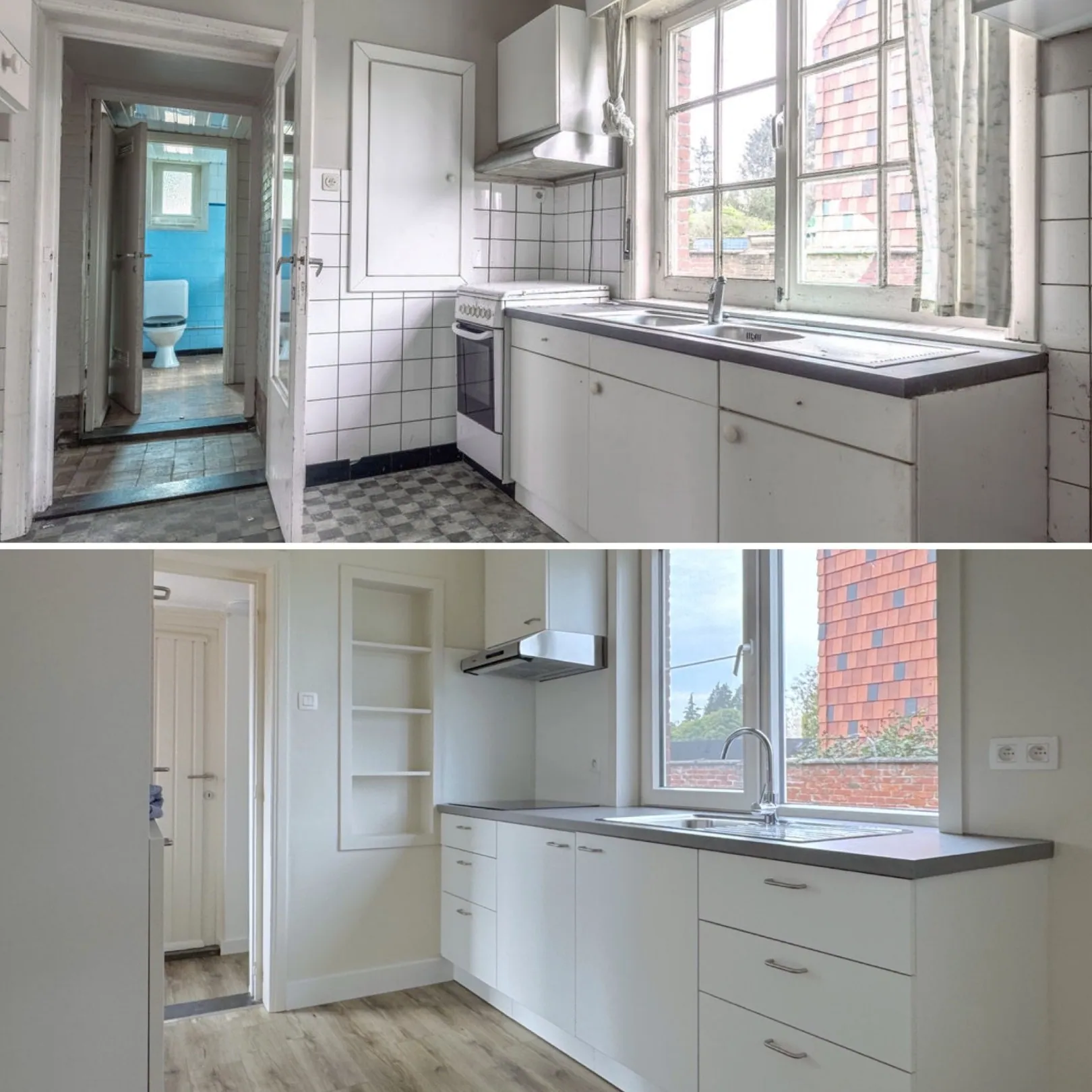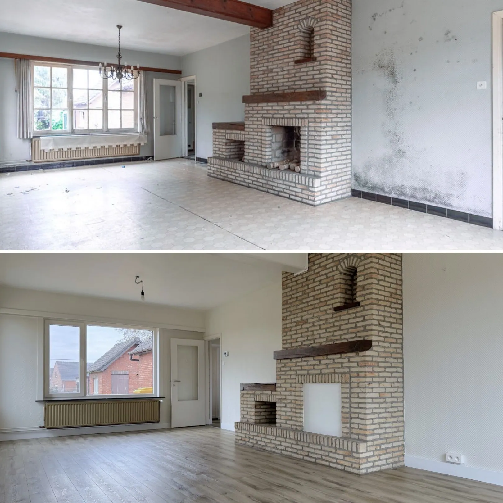 Yessss, weer zo’n heerlijke VOOR en NA. Wat we vorig jaar nog verkochten als een gedateerd renovatieproject kan jij vandaag huren als een vollédig gerenoveerd en instapklaar stulpje. En het allerleukste? De woning werd in een eigentijds jasje gestopt, maarrrr met behoud van de authentieke elementen die dit huis net charmant maken. Een geslaagde make-over!