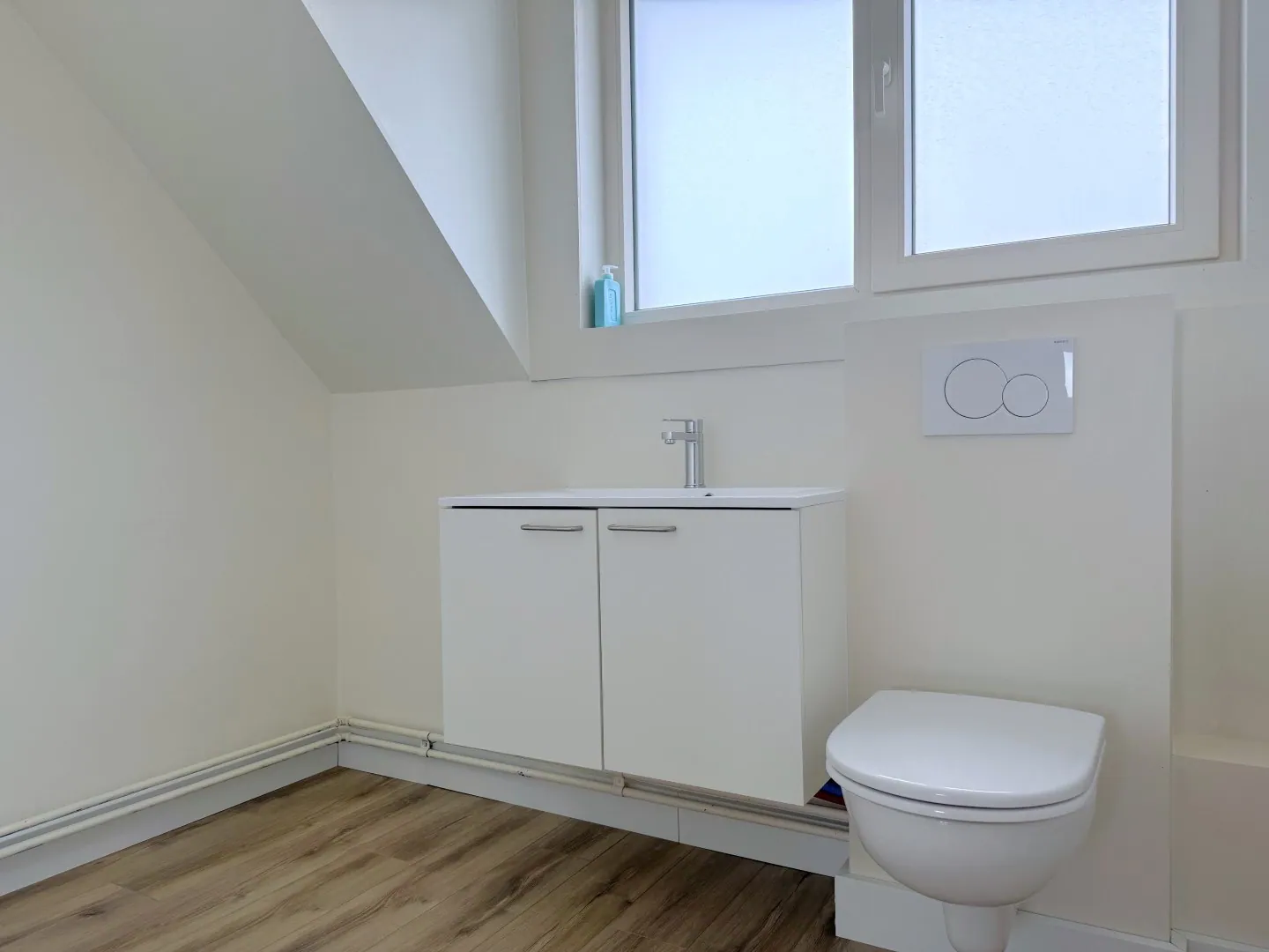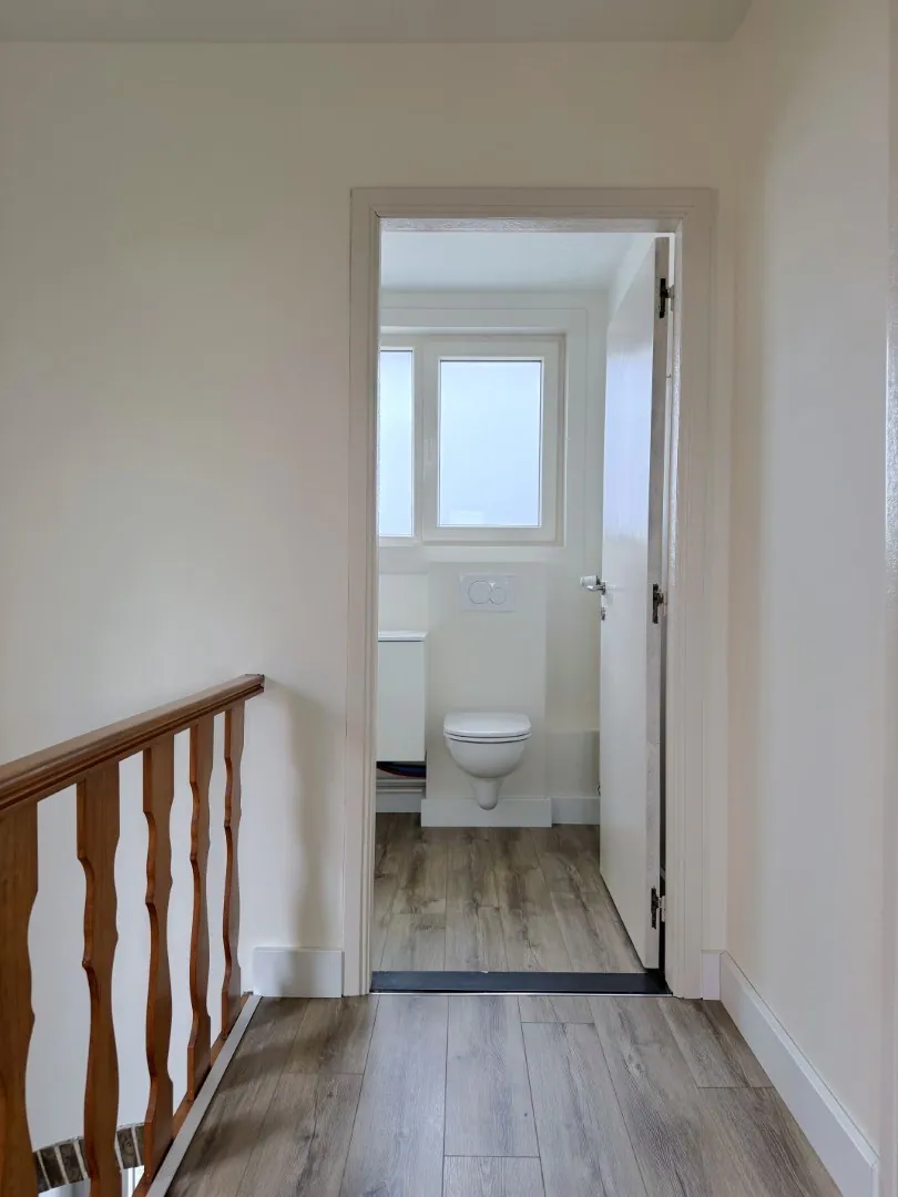 Achter de keuken vinden we nog een aparte wasplaats, en ook de badkamer is beneden. Alle oude rommel werd er vrolijk uitgezwierd, en vervangen door een frisse badkamer met grote inloopdouche, badkamermeubel en een toilet. Clean en onderhoudsvriendelijk.
