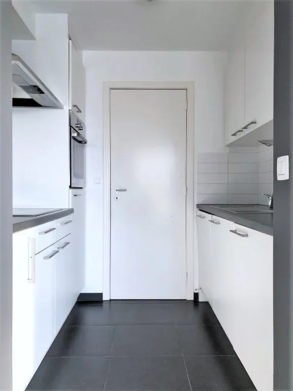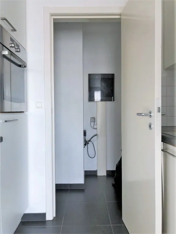 Hoe kan het ook anders: we stappen binnen in een erg lichte woonkamer met voldoende ruimte voor het plaatsen van een zit- en eethoek, met aansluitend de keuken. Deze is ietwat compact, maarrrr alles wat je nodig hebt, zit er in: spoelbak, oven, keramisch fornuis, dampkap, koelkast én vaatwasser. Naast de keuken nog een kleine bergruimte, met ... aansluitingen voor wassen en drogen.