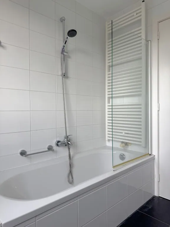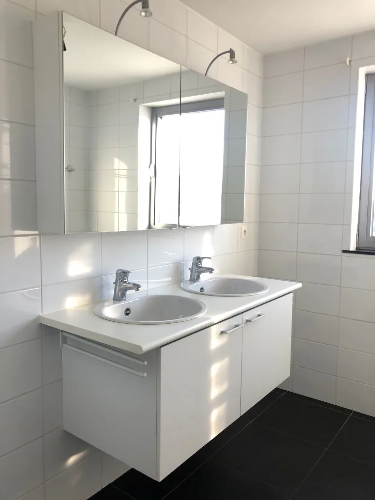 Er zijn 2 slaapkamers aanwezig. De kleinste (slaap)kamer is geen balzaal, maar kan prima dienst doen als babykamer of kantoorruimte. In de badkamer zien we een dubbele wastafel en een bad met geïntegreerde douche.