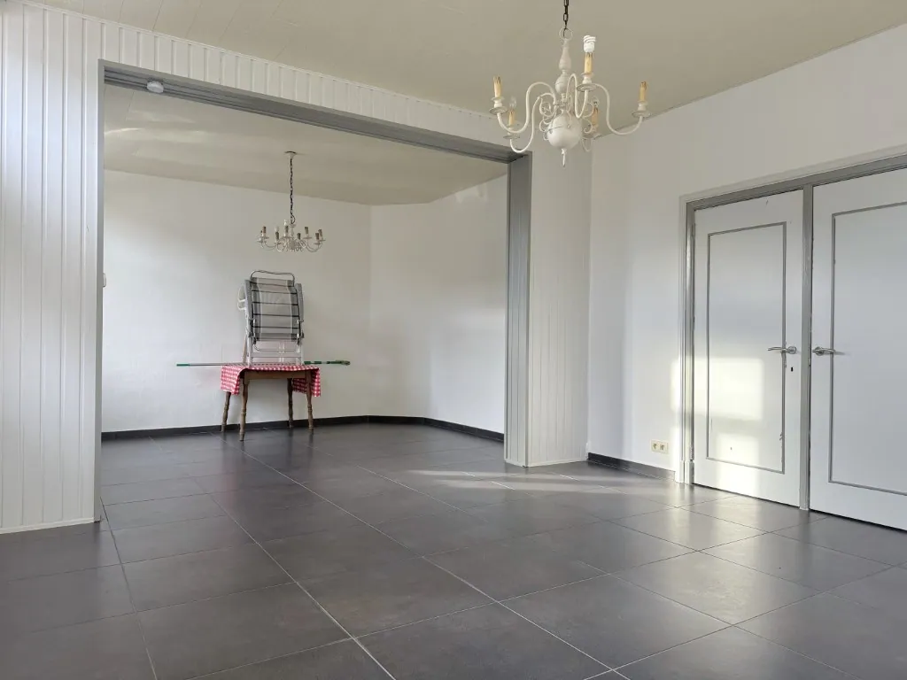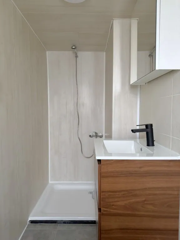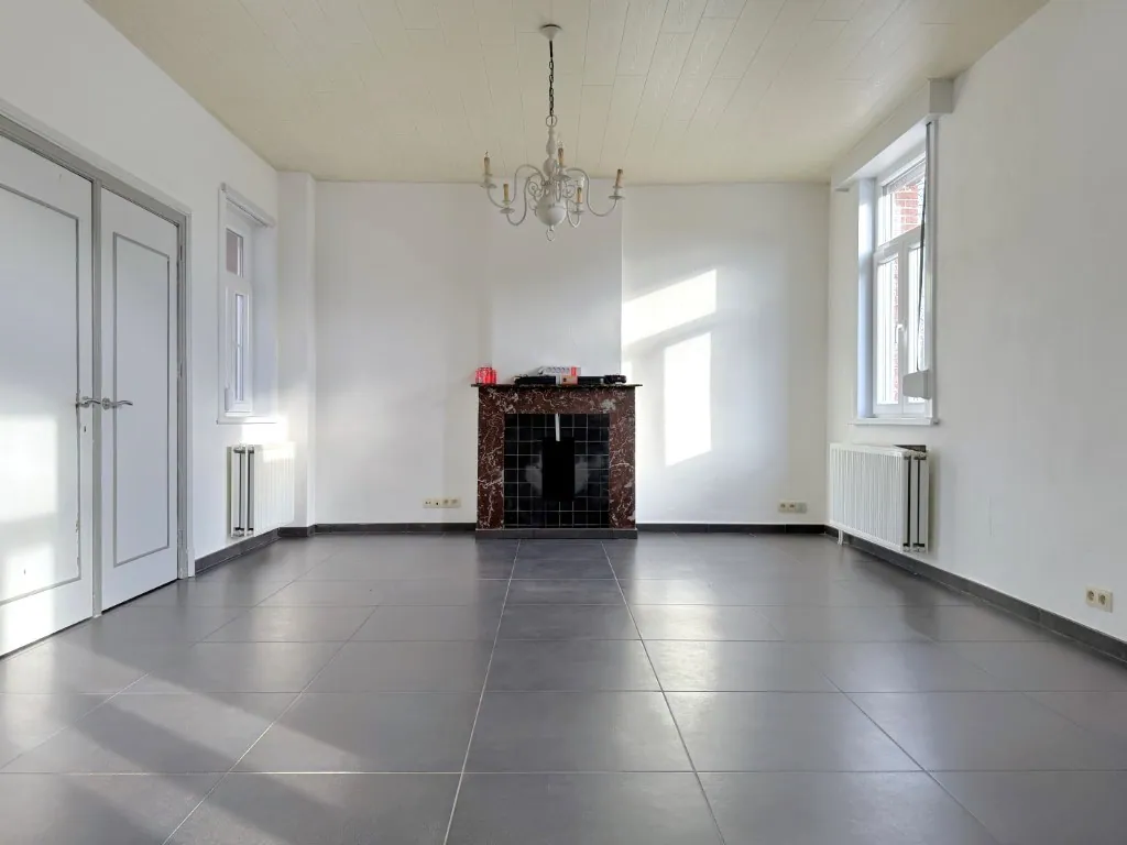 Via de voordeur vallen we meteen met de deur in huis. Of specifieker: in de woonkamer. Een grote open ruimte, met nog enkele gezellige features zoals de schouwmantel, hoge plafonds en de dubbele deuren naar de hal. Achter die dubbele deuren kan je ook de toegang naar de keuken vinden. Deze werd net nog in een nieuw jasje gestopt, dus je kan meteen aan de slag. Naast de keuken een compacte ... douchekamer met badkamermeubel en toilet.