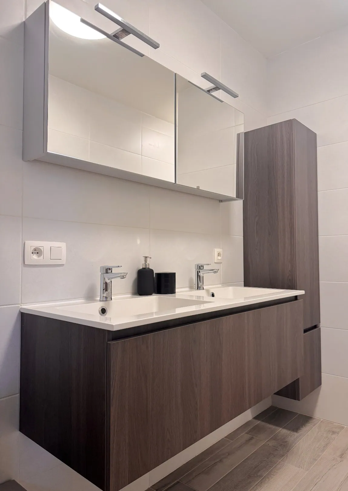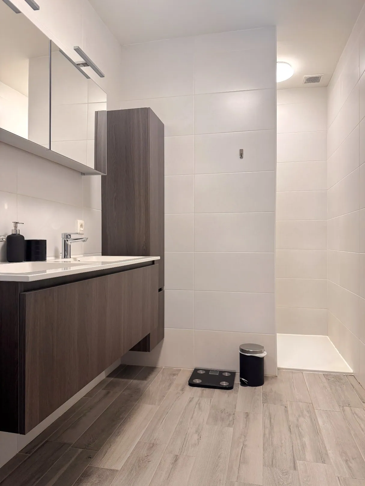 Verder vinden we op deze verdieping nog de badkamer, voorzien van een dubbele ... wastafel en douche. Praktisch én comfortabel.