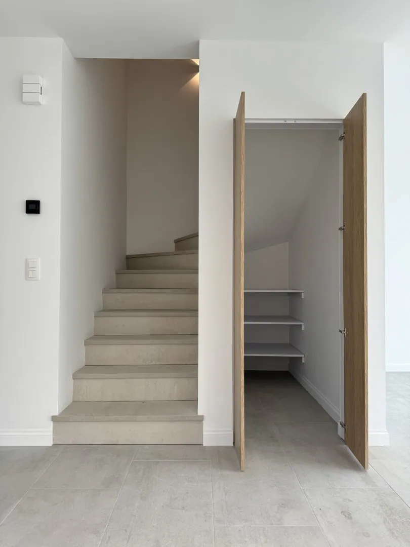 Door de hippe deur stappen we de woonkamer in met open keuken. Een lekker lichte, open lay-out met fijn zicht op de tuin. De keuken is voorzien van alle snufjes. Heb je ... trouwens gemerkt dat alle hoekjes en kantjes goed benut werden? Check de handige bergkast onder de trap!
