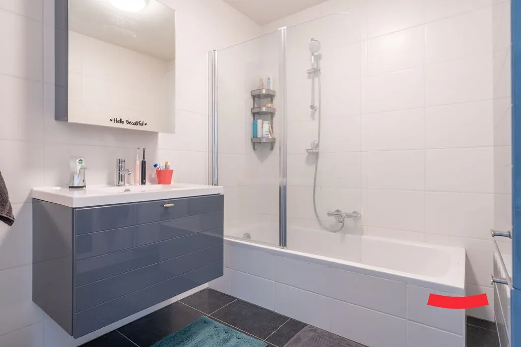 Verder vinden we op deze verdieping 2 slaapkamers, en een badkamer met een bad (met douchescherm) en wastafel.