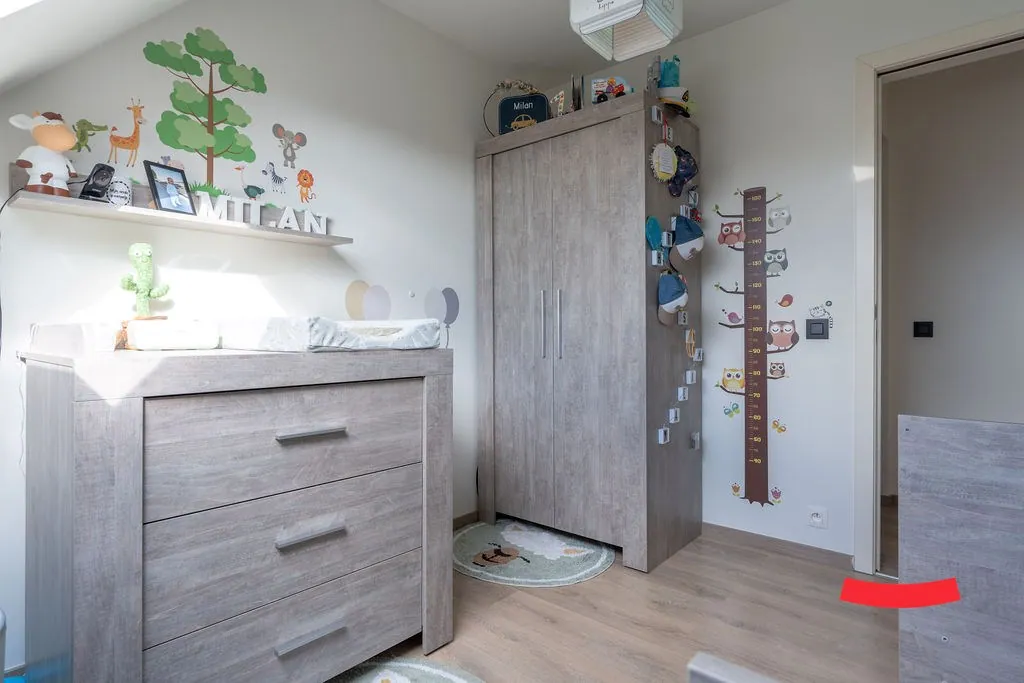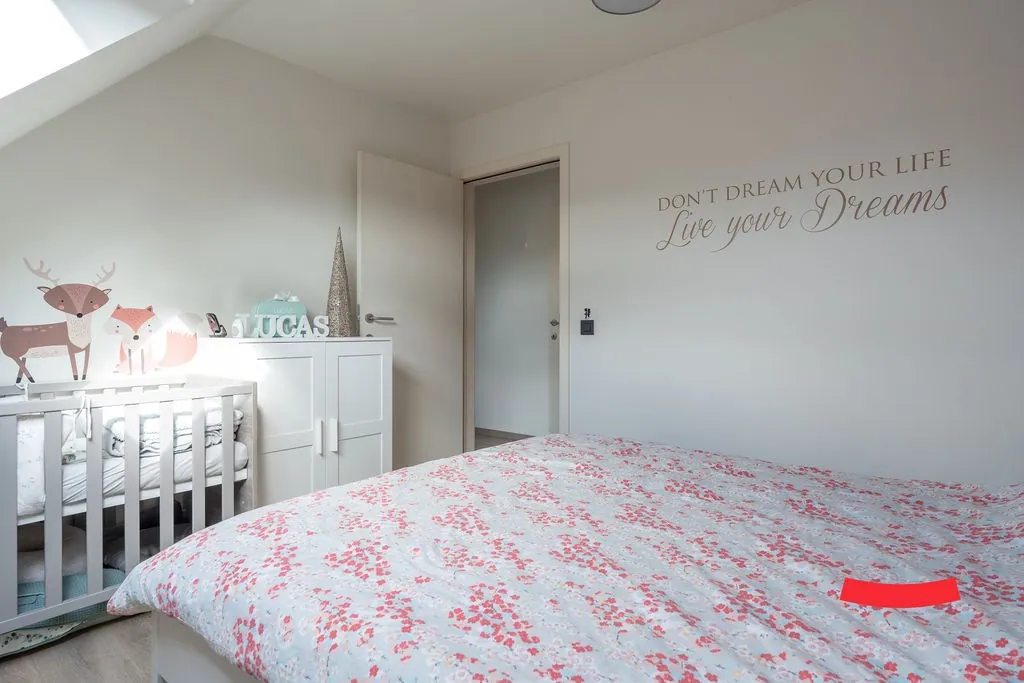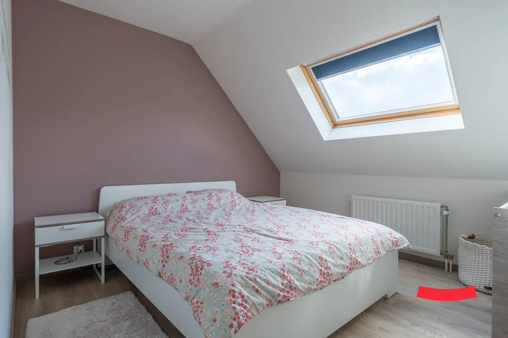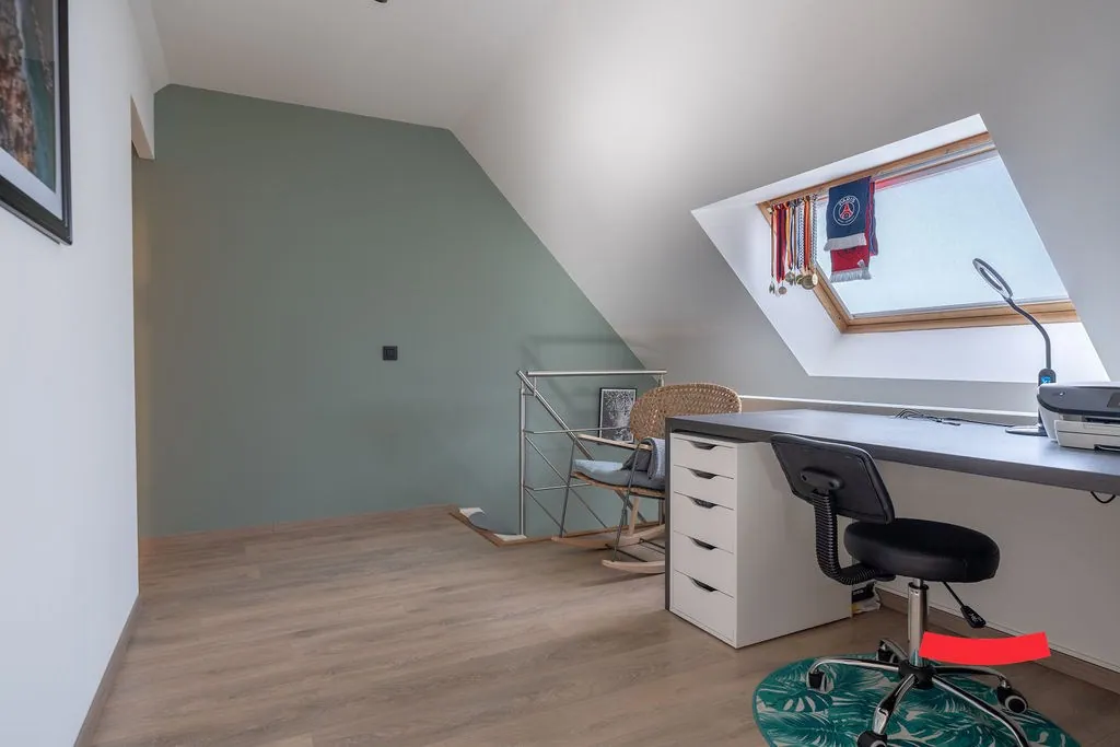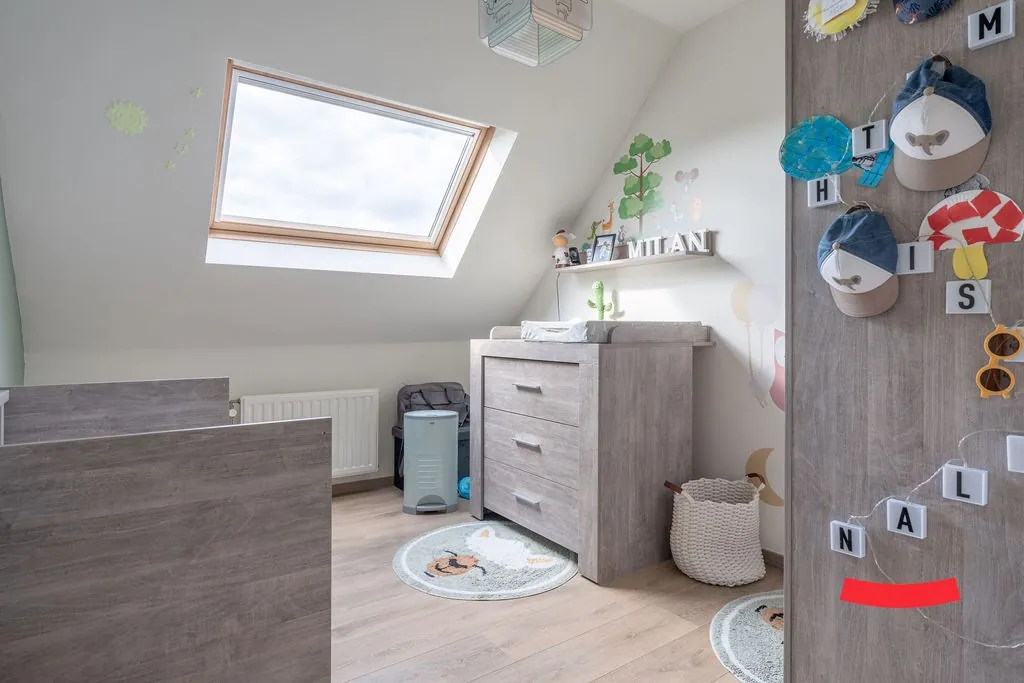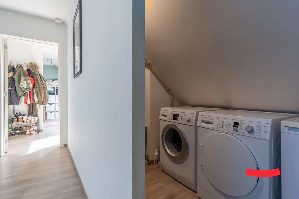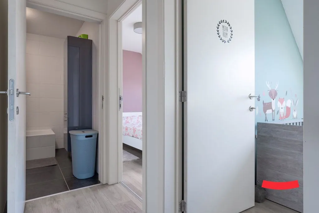 De trap in de woonkamer brengt ons bij de bovenverdieping. Heb je al gespot dat de eerste kamer volledig open is? Ideaal als bureau of speelkamer voor de kinderen: je staat nog steeds in verbinding met de woonkamer, maarrrrr je hoeft niet op te ruimen als je gasten in de woonkamer hebt. Dubbelcheck! Of wat dacht je van het omtoveren naar een gave inloopkast bij de master bedroom? Er is namelijk aansluitend nog een ruime slaapkamer. Verder vinden we hier ook de wasplaats.