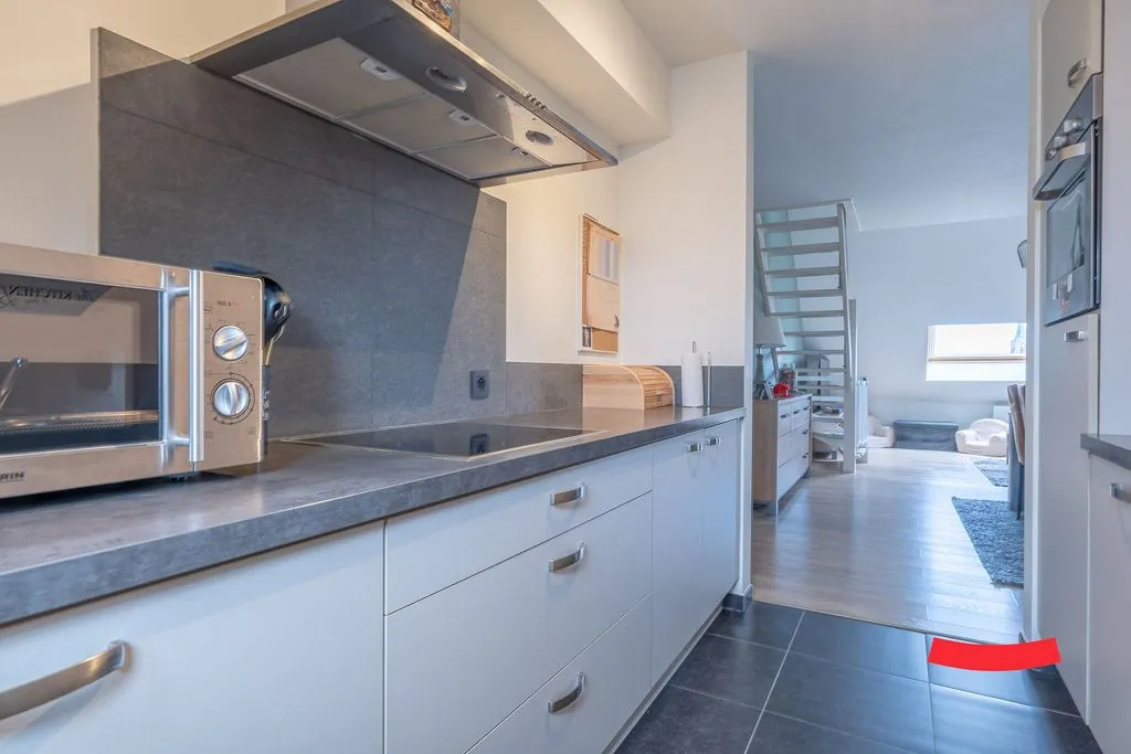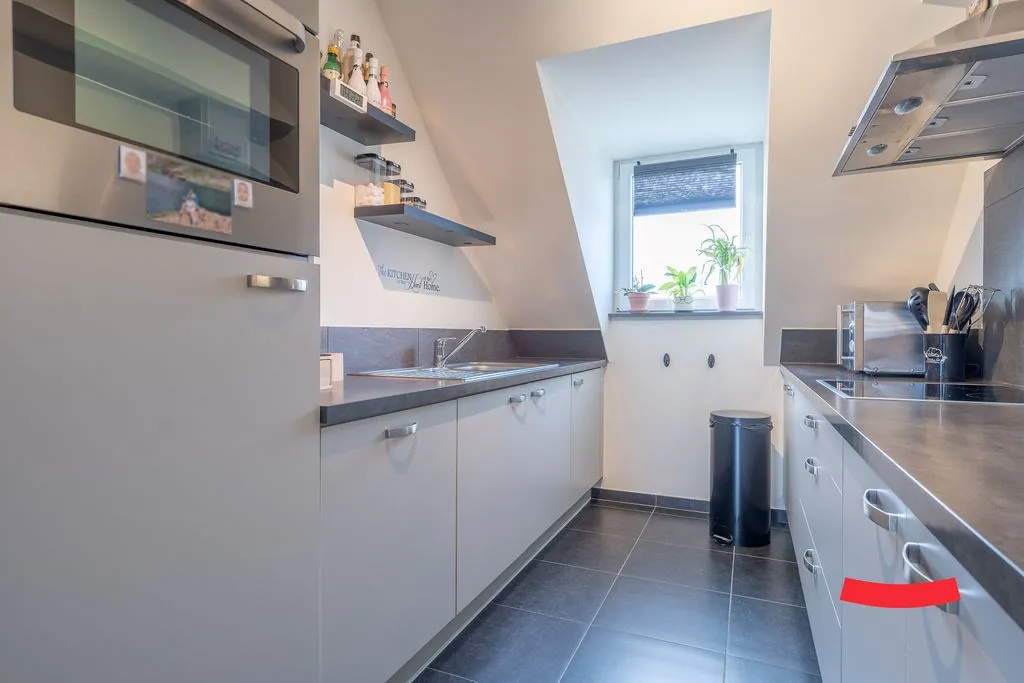 En dan stappen we de woonkamer in: een 10 voor sfeer en gezelligheid, toch? Een open lay-out, die nog eens extra in de verf wordt gezet door het hoge plafond en de vele ramen. De open keuken is voorzien van alle nodige snufjes, en werd verrassend praktisch ingericht.