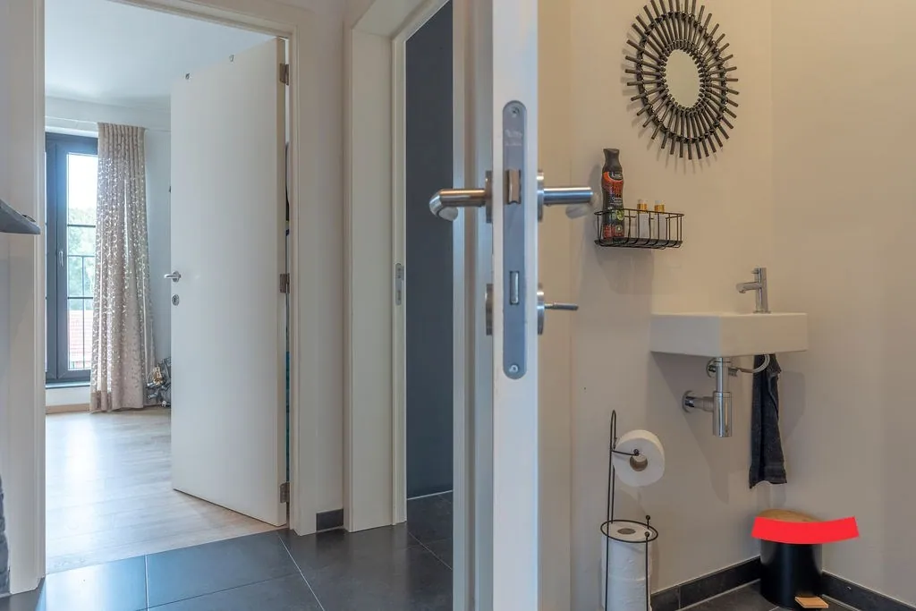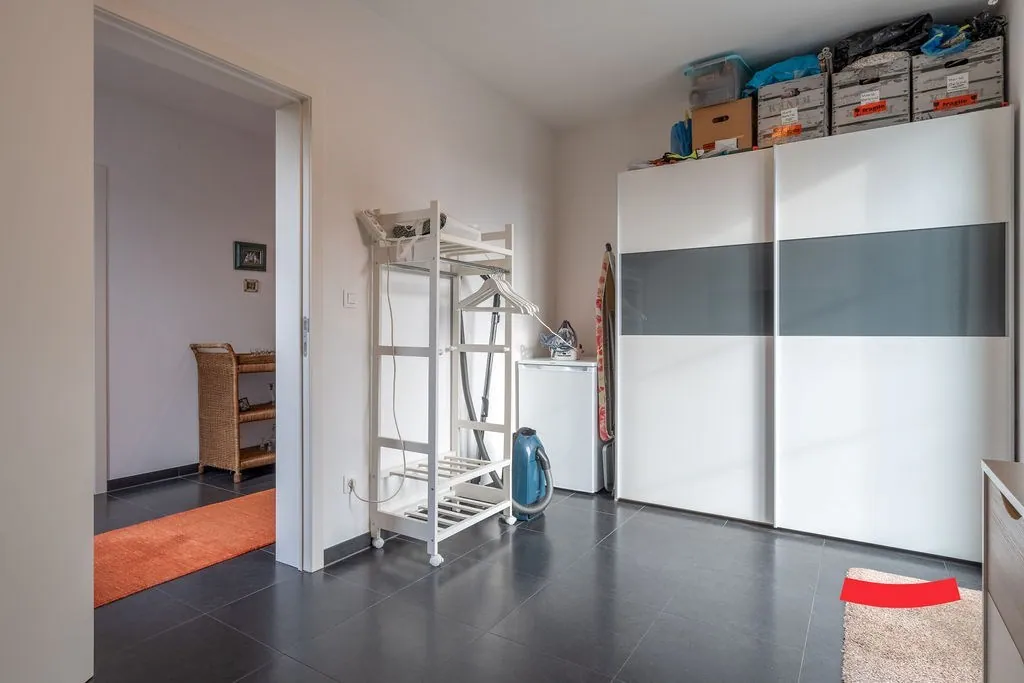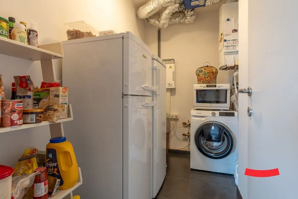 De inkomhal is een fijne binnenkomer: voldoende ruim en lekker licht. Aansluitend vinden we een ruime woonkamer met open keuken. Deze laatste werd afgewerkt met hoogwaardige materialen en voorzien van alle snufjes. Hip, trendy én handig. Verder is er een bergruimte met aansluitingen voor wassen en drogen.