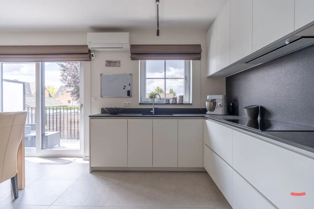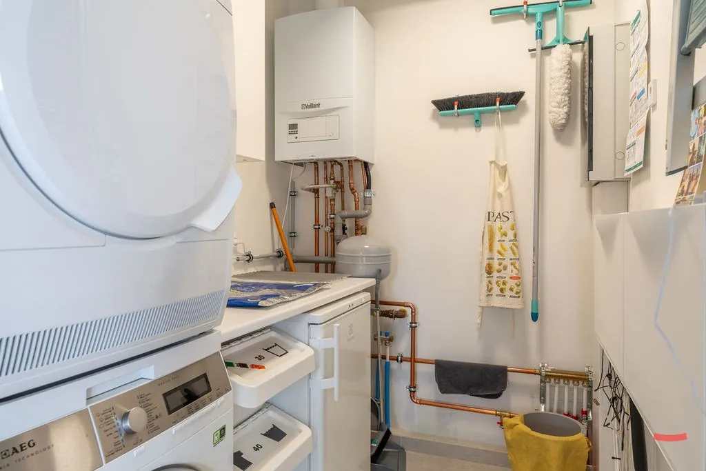 Zullen we beginnen aan de achterkant? Want da’s meteen 1 van de grote troeven van dit stulpje: een héérlijk lichte, open lay-out met keuken en woonkamer. De keuken is clean, onderhoudsvriendelijk en voorzien van alle nodige snufjes. Heb je ook de airco gespot? Verder heb je om de hoek nog een handige bergplaats, met aansluitingen voor wassen en drogen.