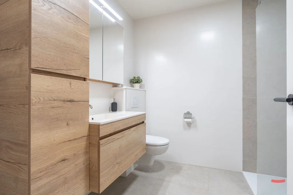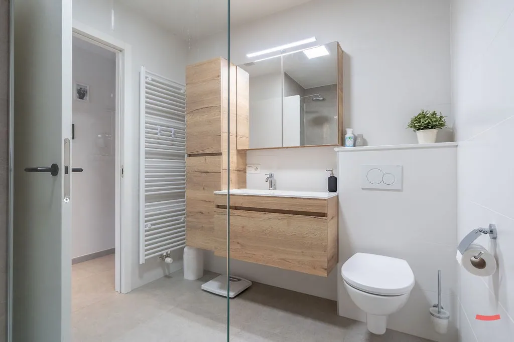 Aan de voorzijde vinden we 2 slaapkamers, met ... de badkamer ernaast. Geen donker hoekje, maar een lekker lichte badkamer met een inloopdouche, een wastafel met voldoende opbergruimte en een toilet. Neutraal en onderhoudsvriendelijk, zo hebben wij het graag. Er is trouwens nog een apart (gasten)toilet, dus je hoeft ’s morgen niet in de file te staan.