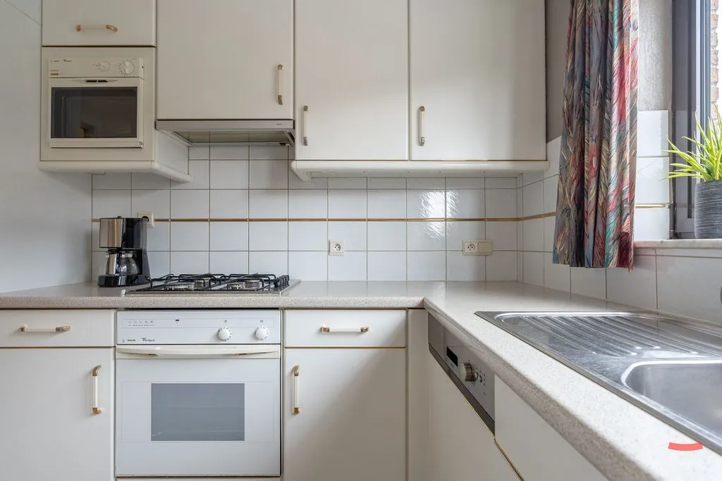 Om de hoek vinden we de keuken. Die is niet nieuw, maar wel netjes. Heel netjes. Dus graag eerst wat creatief opsmukken om nog een paar jaartjes mee te kunnen en zo wat door te sparen, of liever de grote middelen en meteen een volledig nieuwe keuken erin? That’s up to you. Naast de keuken zit trouwens nog een compacte, maar handige bergplaats.