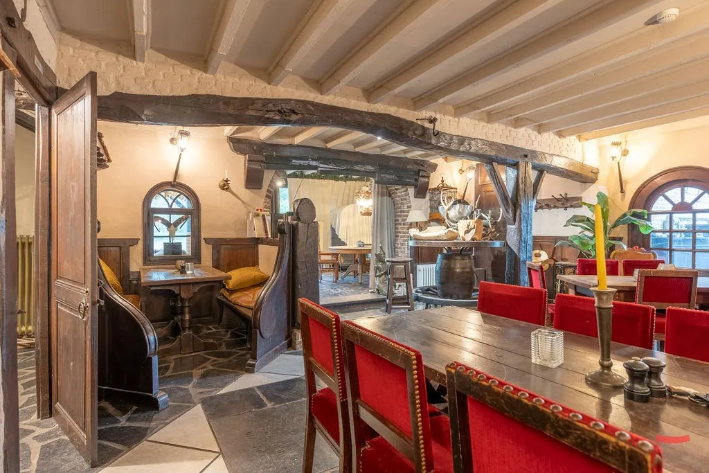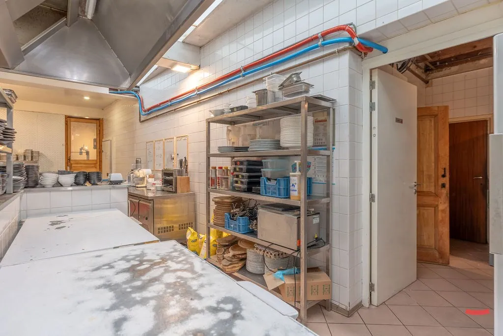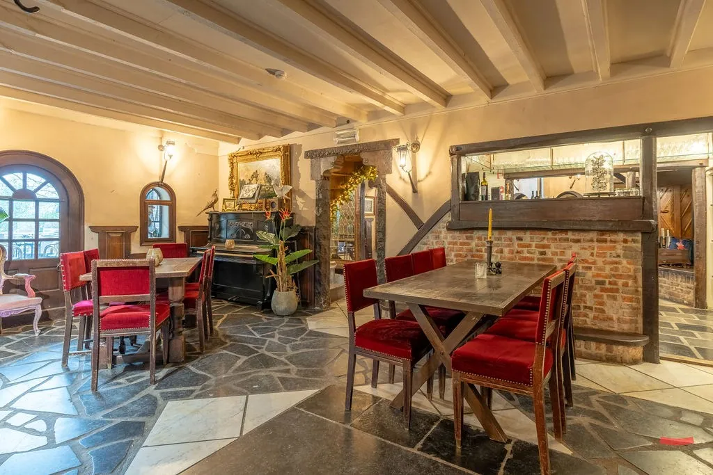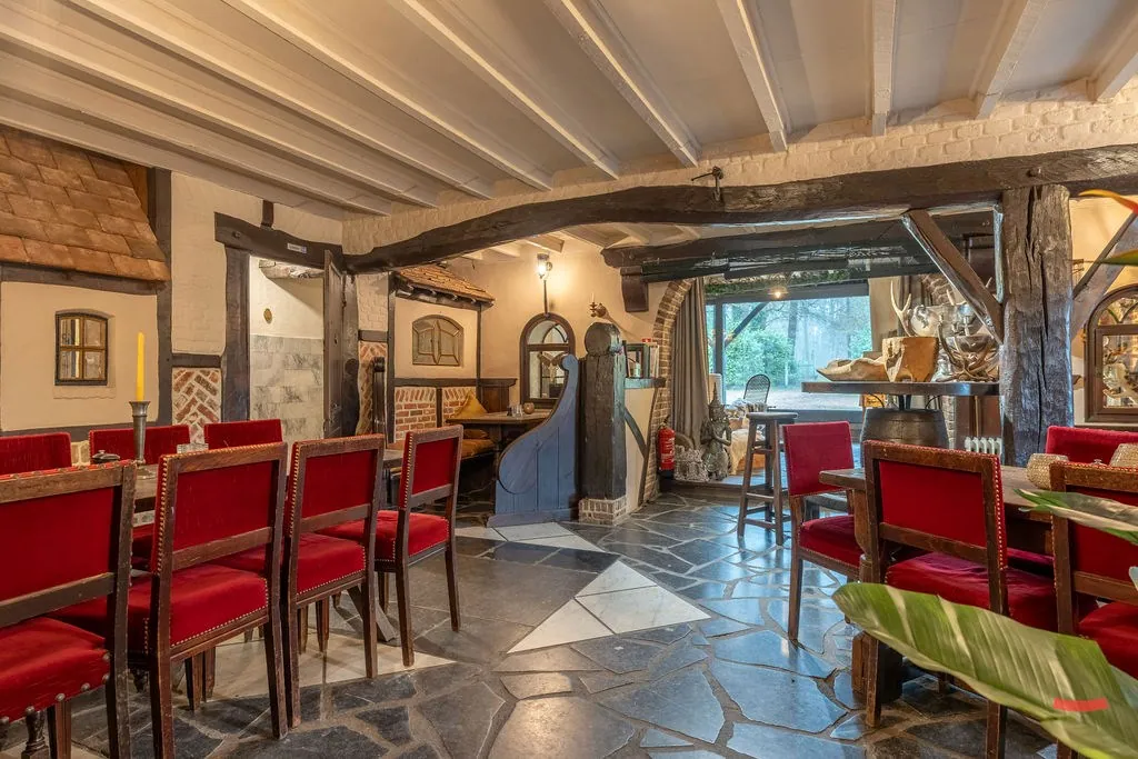 Hoe het gebouw momenteel ingedeeld is, vraag je? Er is een restaurant met bar, keuken en feestzaal, sanitaire blok, woonruimte met slaapkamers en een polyvalente ruimte die nu gebruikt wordt als hobbyruimte/showroom.