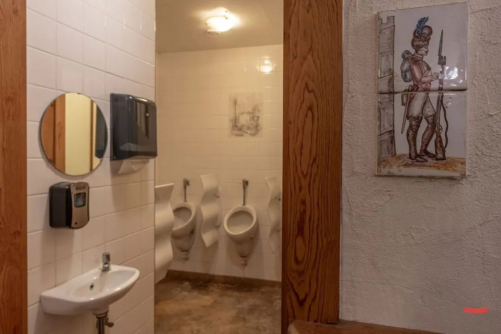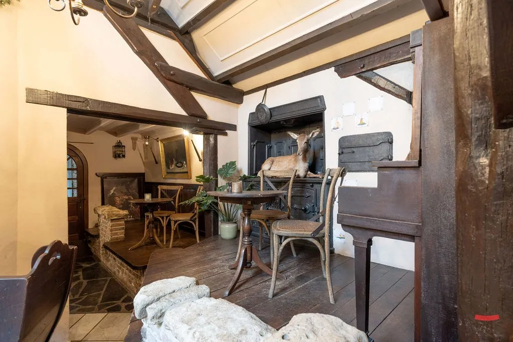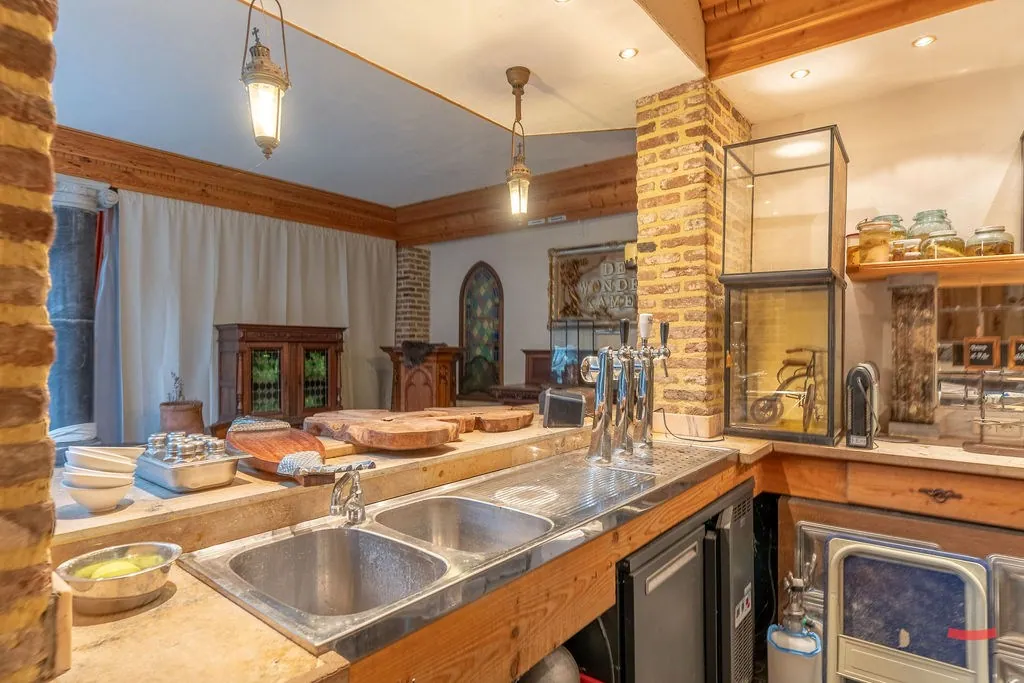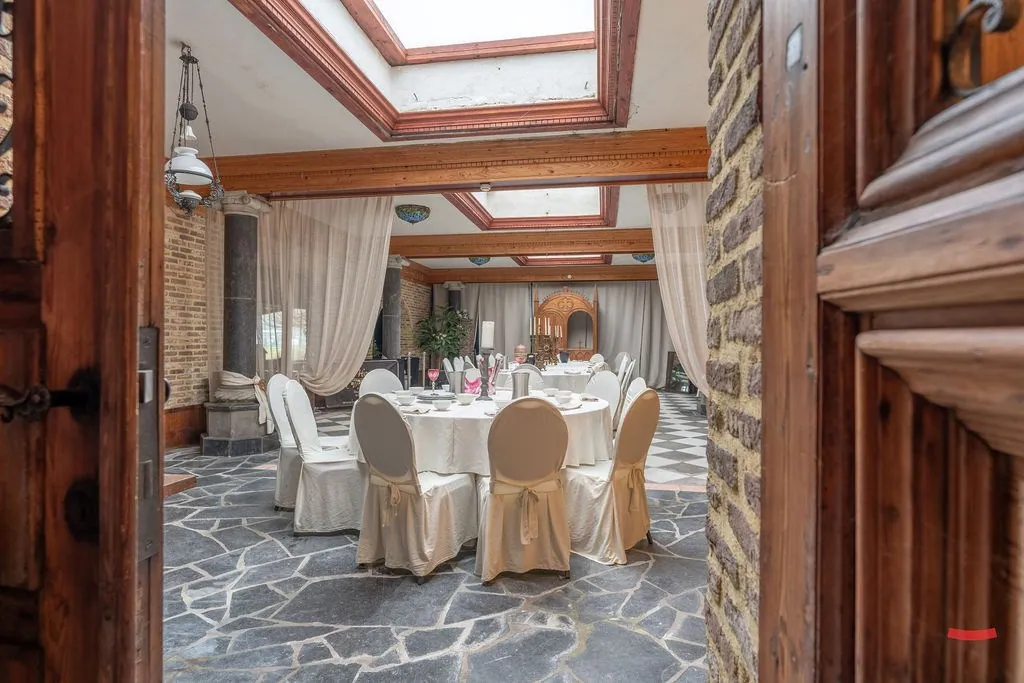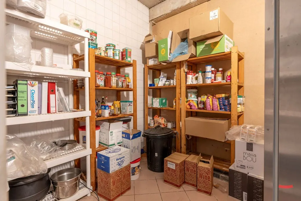 Hoe het gebouw momenteel ingedeeld is, vraag je? Er is een restaurant met bar, keuken en feestzaal, sanitaire blok, woonruimte met slaapkamers en een polyvalente ruimte die nu gebruikt wordt als hobbyruimte/showroom.
