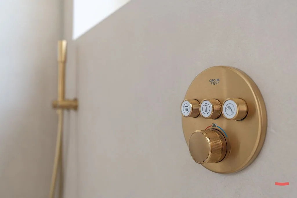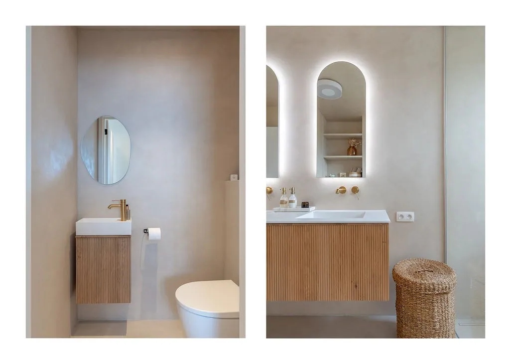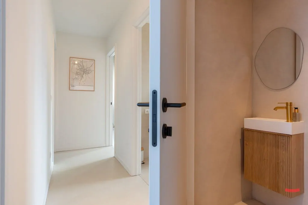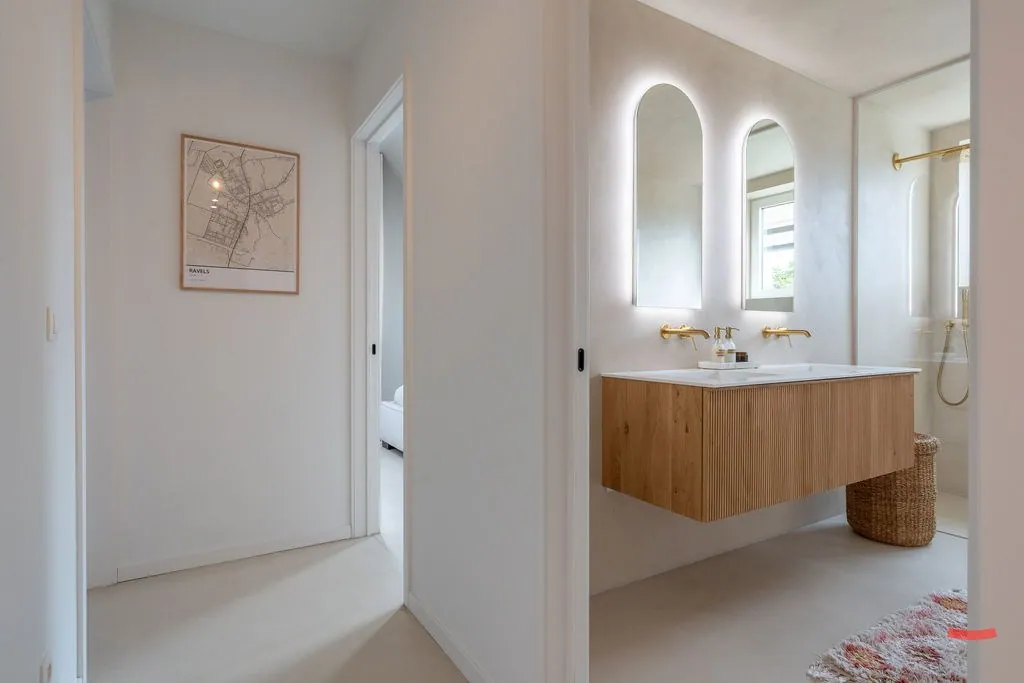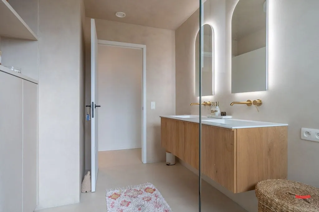 En dan die badkamer…die is Zen. Jawel, met hoofdletter Z, want hier kom je echt tot rust. Ook hier werd gebruikt gemaakt van doordachte lijnen en materialen, zodat ‘ie volledig in het plaatje past. Hier is een grote douche, dubbele wastafel en heel wat opbergruimte. Het toilet is apart.