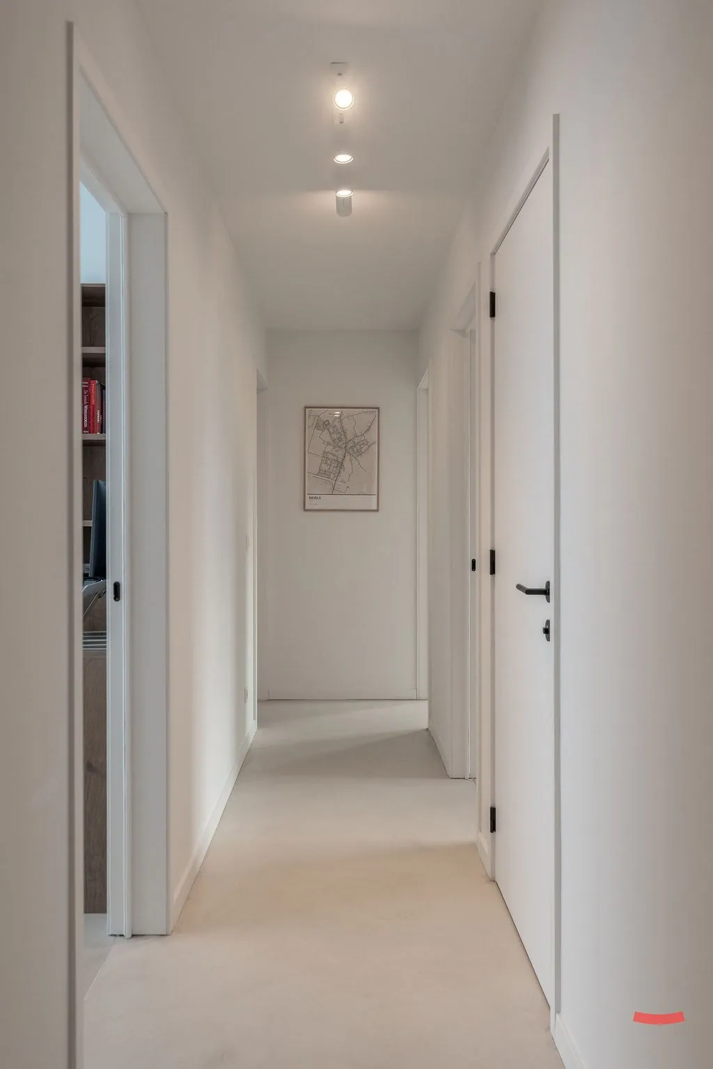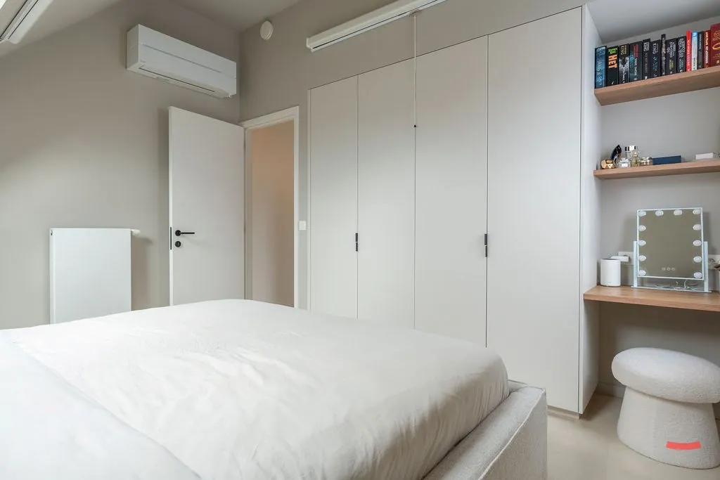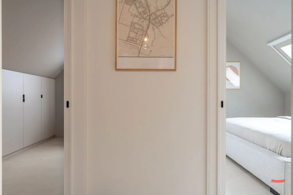 Aan de andere kant van de gang komen we bij de (slaap)kamers. Moment is één kamer ingericht als slaapkamer, de andere is een bureau/wasplaats en de laatste is een grote dressing. Alle kamers werden ingericht met vaste kasten, want hoe kan het ook anders?